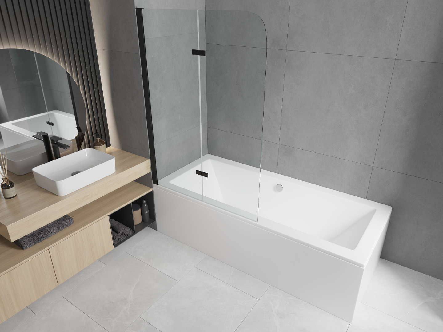 Paravent composé de deux battants pouvant être repliés. Cette solution permet d'économiser plus d'espace dans la salle de bain et de profiter librement du reste de l'espace lorsque nous n'utilisons pas la zone de bain.