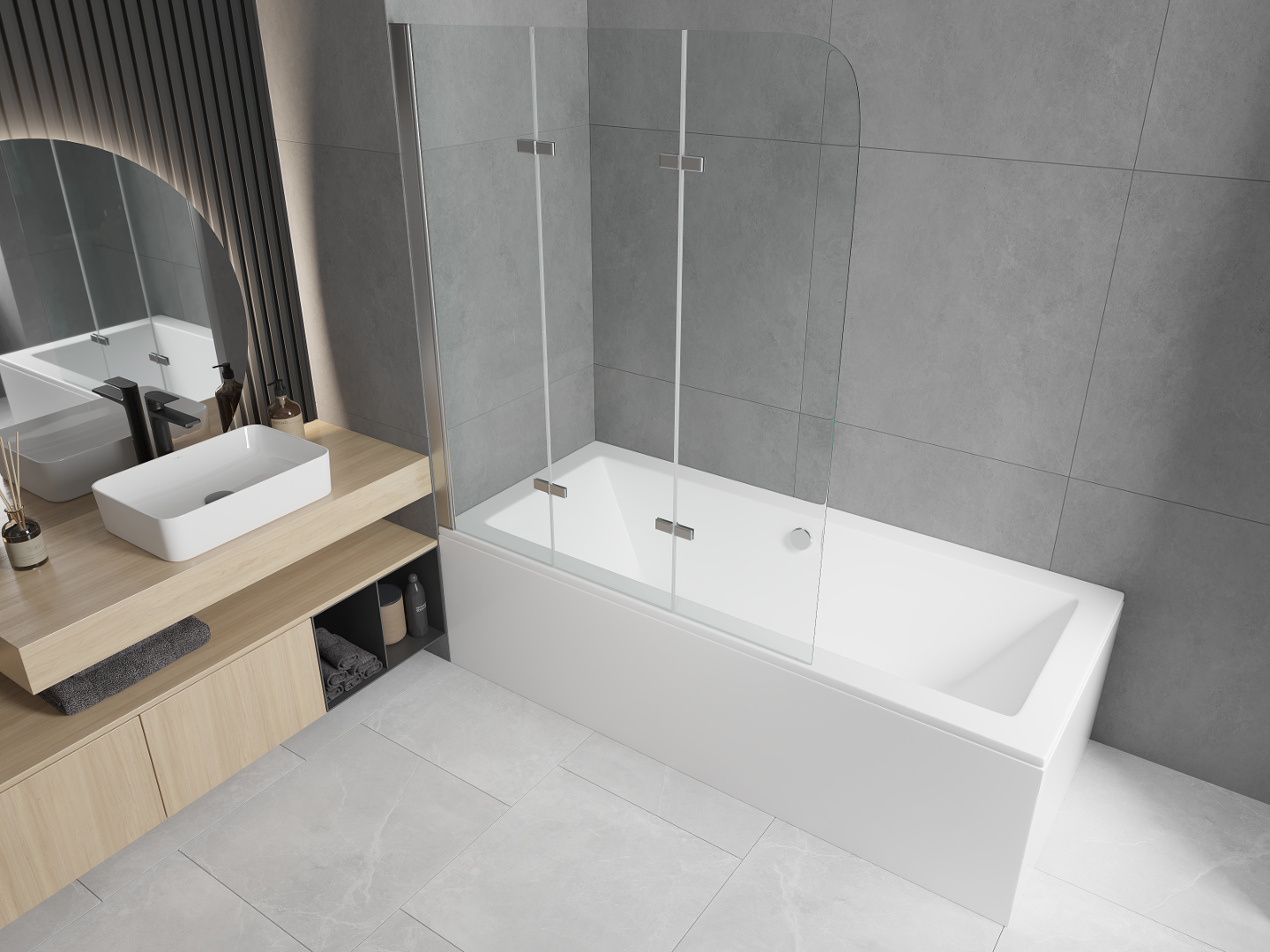 Paravent composé de trois panneaux avec possibilité de pliage. Cette solution permet d'économiser plus d'espace dans la salle de bain et permet d'utiliser librement le reste de l'espace lorsque nous n'utilisons pas la zone de bain.