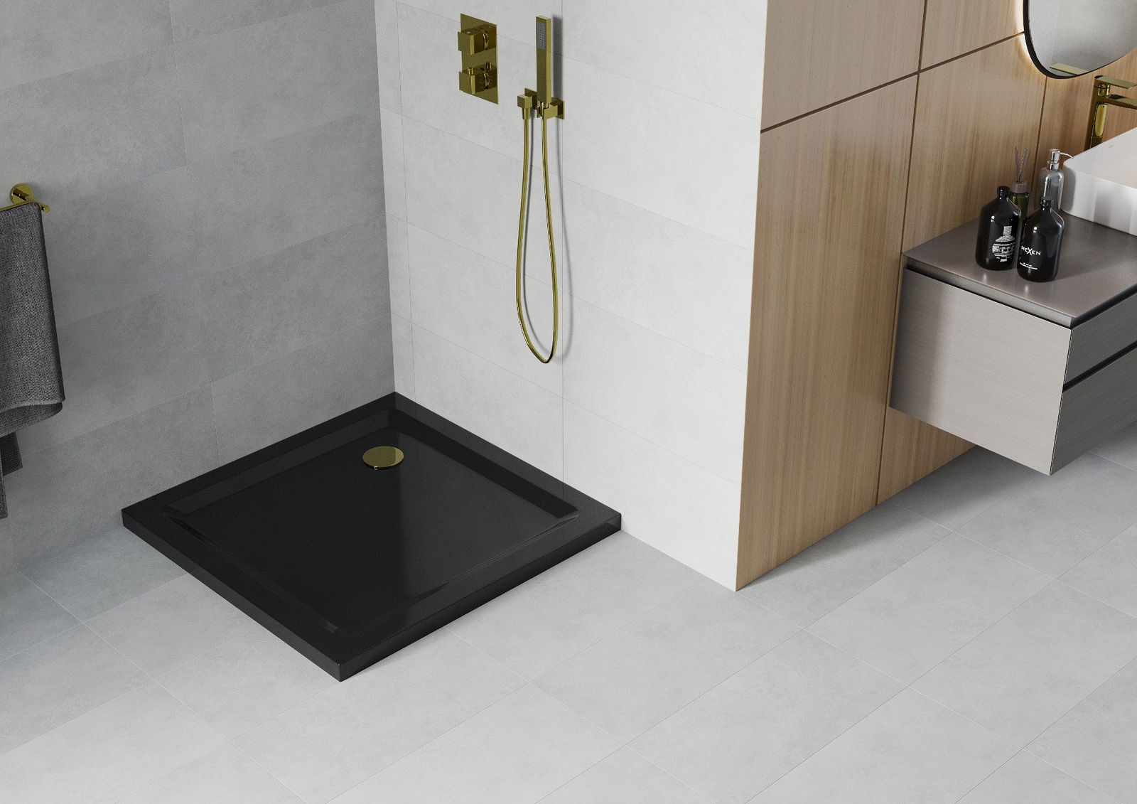Mexen Flat receveur de douche carré slim 90 x 90 cm, noir, siphon doré - 40709090G
