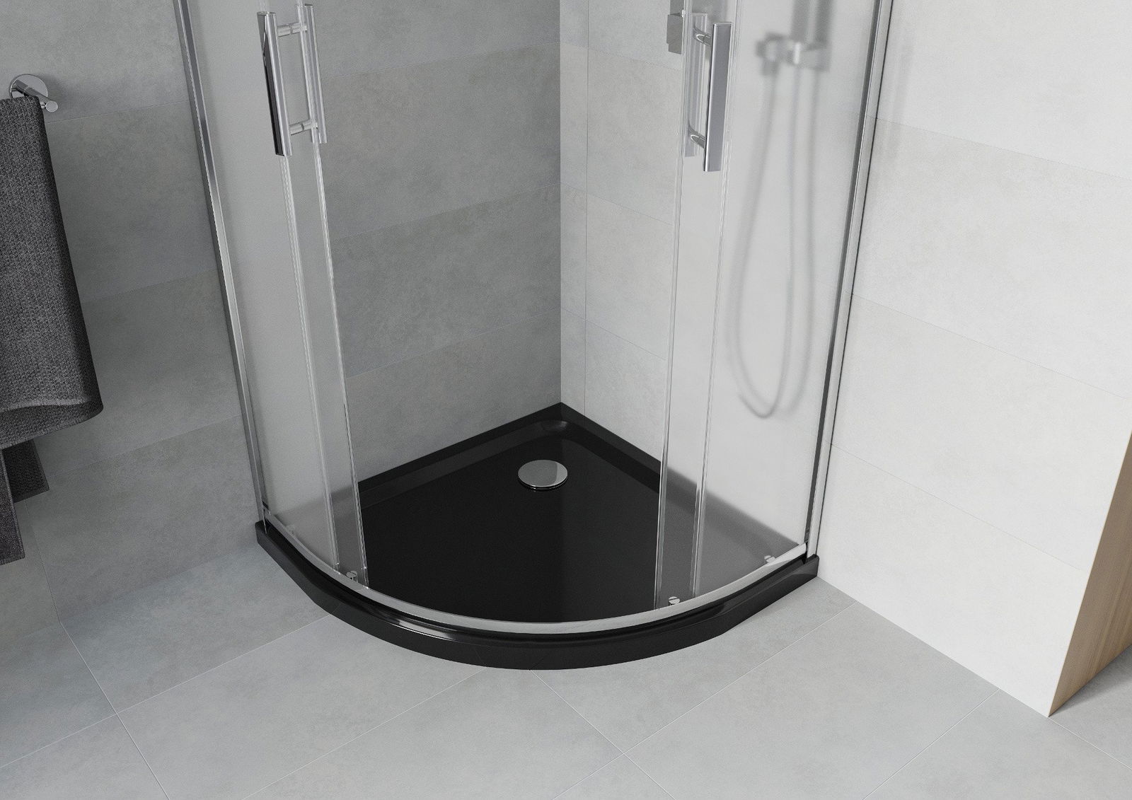 La poignée pratique et confortable est fabriquée en métal durable et résistant. Sa forme élégante, associée à une finition assortie à la couleur des profilés, confère à l'ensemble un style moderne et élégant, soulignant l'esthétique de chaque salle de bains.