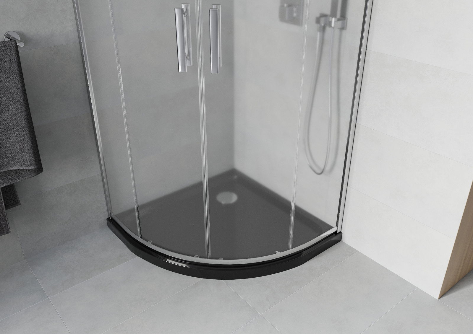 La poignée pratique et confortable est fabriquée en métal durable et résistant. Sa forme élégante, associée à une finition assortie à la couleur des profilés, confère à l'ensemble un style moderne et élégant, soulignant l'esthétique de chaque salle de bains.