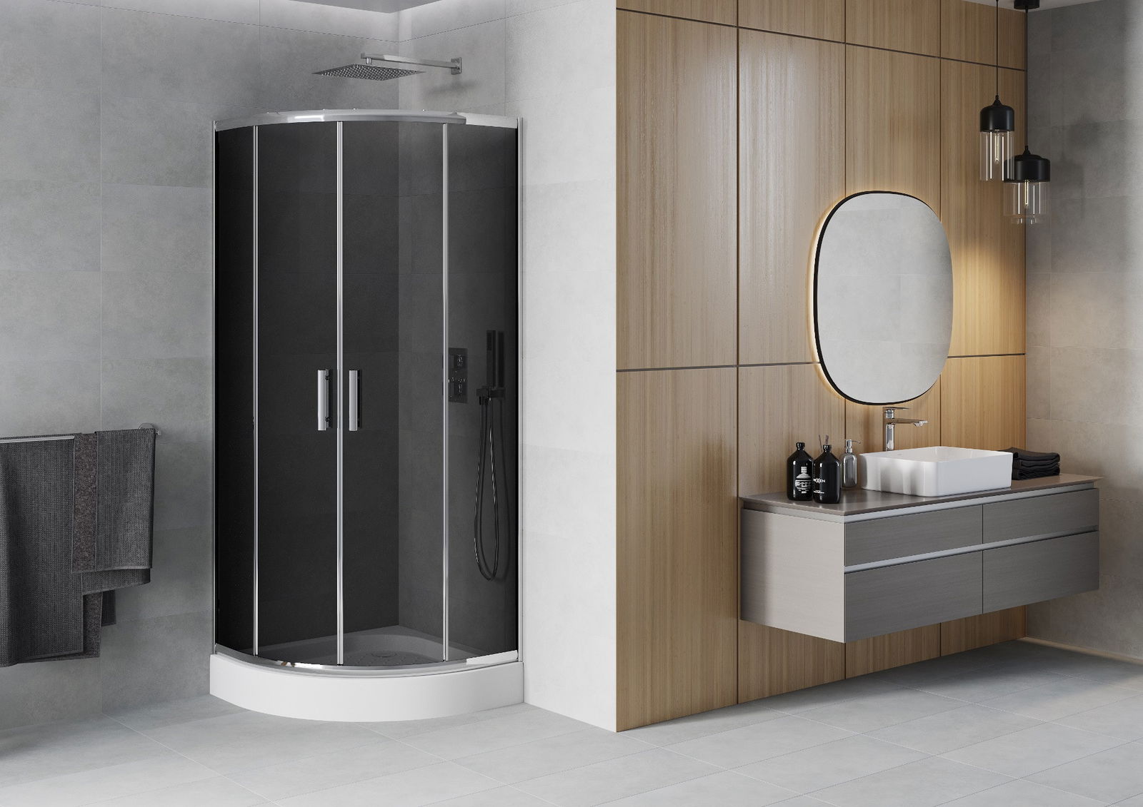 La poignée pratique et confortable est fabriquée en métal durable et résistant. Sa forme à la mode, combinée à une finition assortie à la couleur des profilés, donne à l'ensemble un aspect moderne et stylé, soulignant l'esthétique de chaque salle de bain.