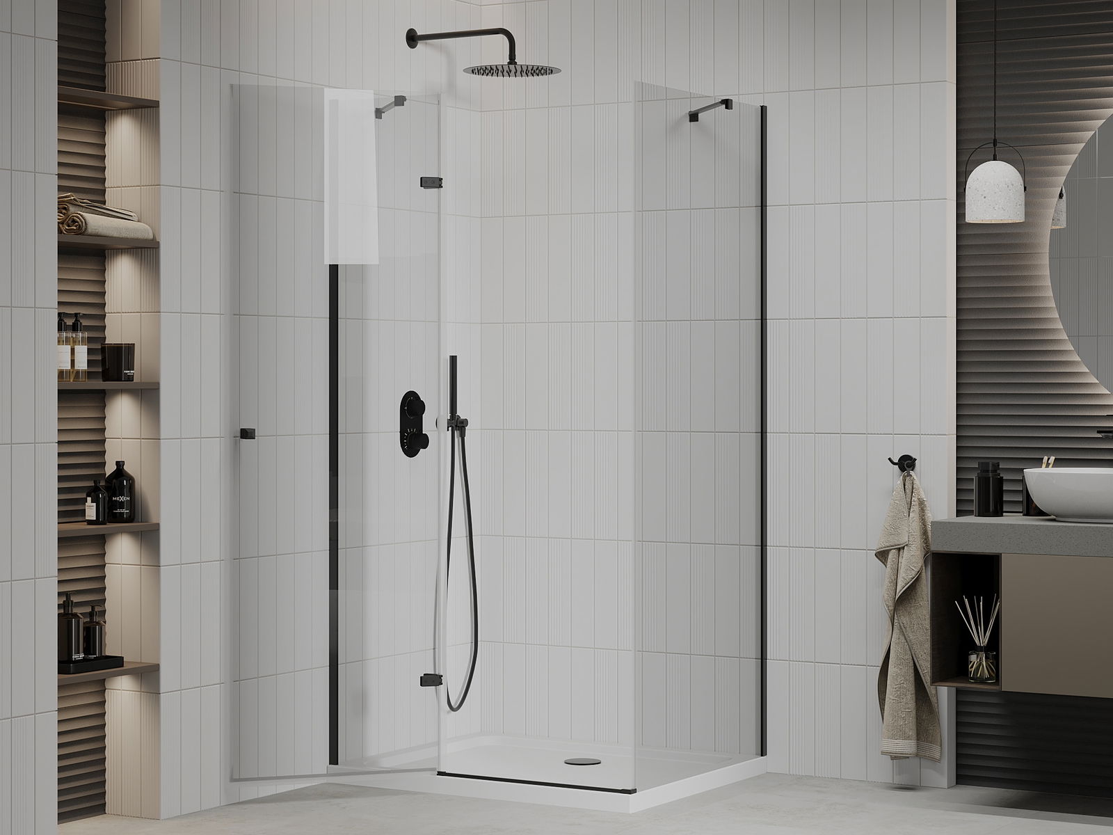 La poignée pratique et confortable est fabriquée en métal durable et résistant. Sa forme élégante, associée à une finition assortie à la couleur des profilés, confère à l'ensemble un style moderne et élégant, soulignant l'esthétique de chaque salle de bains.