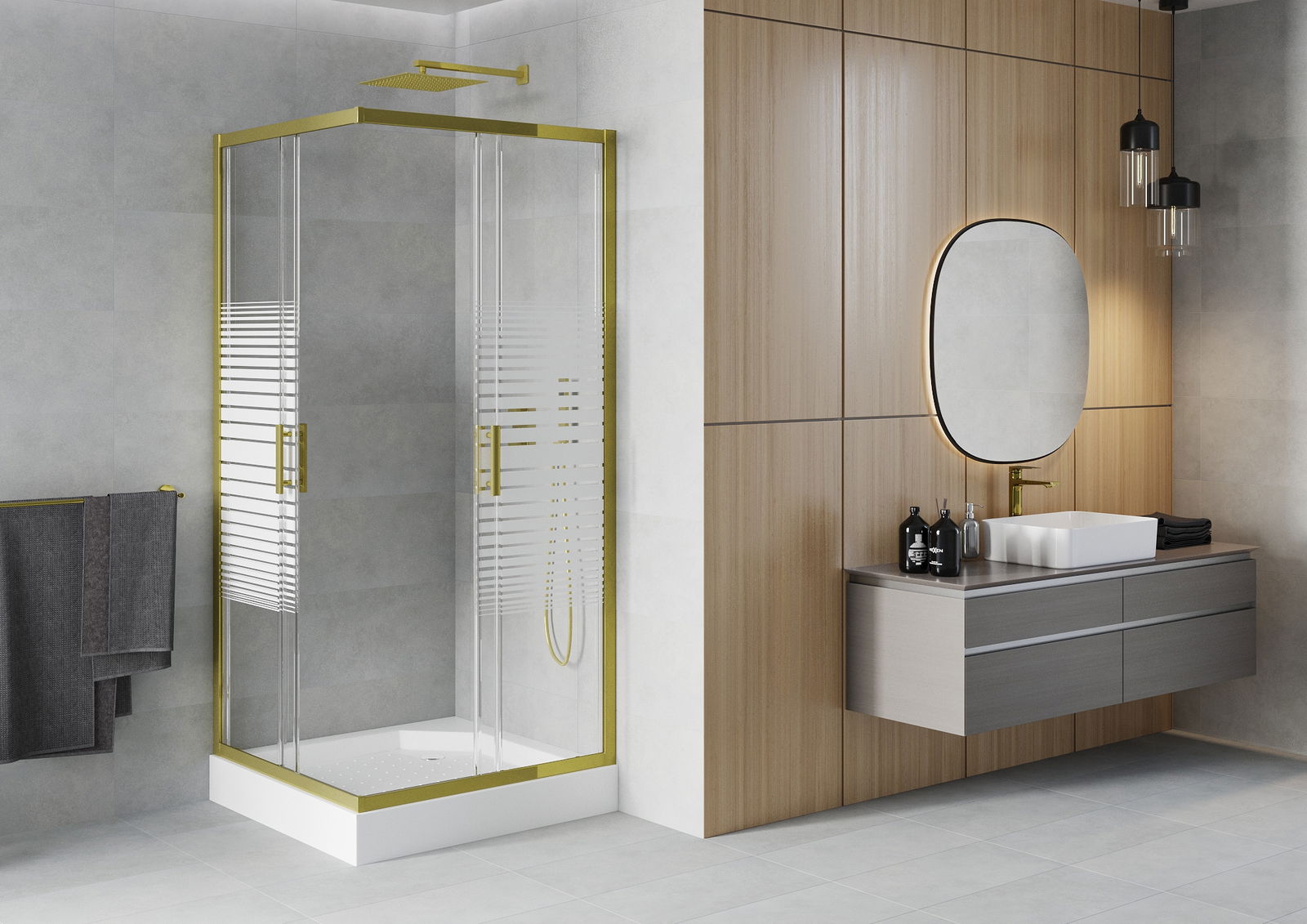 La poignée pratique et confortable est fabriquée en métal durable et résistant. Sa forme élégante, associée à une finition assortie à la couleur des profilés, confère à l'ensemble un style moderne et élégant, soulignant l'esthétique de chaque salle de bains.