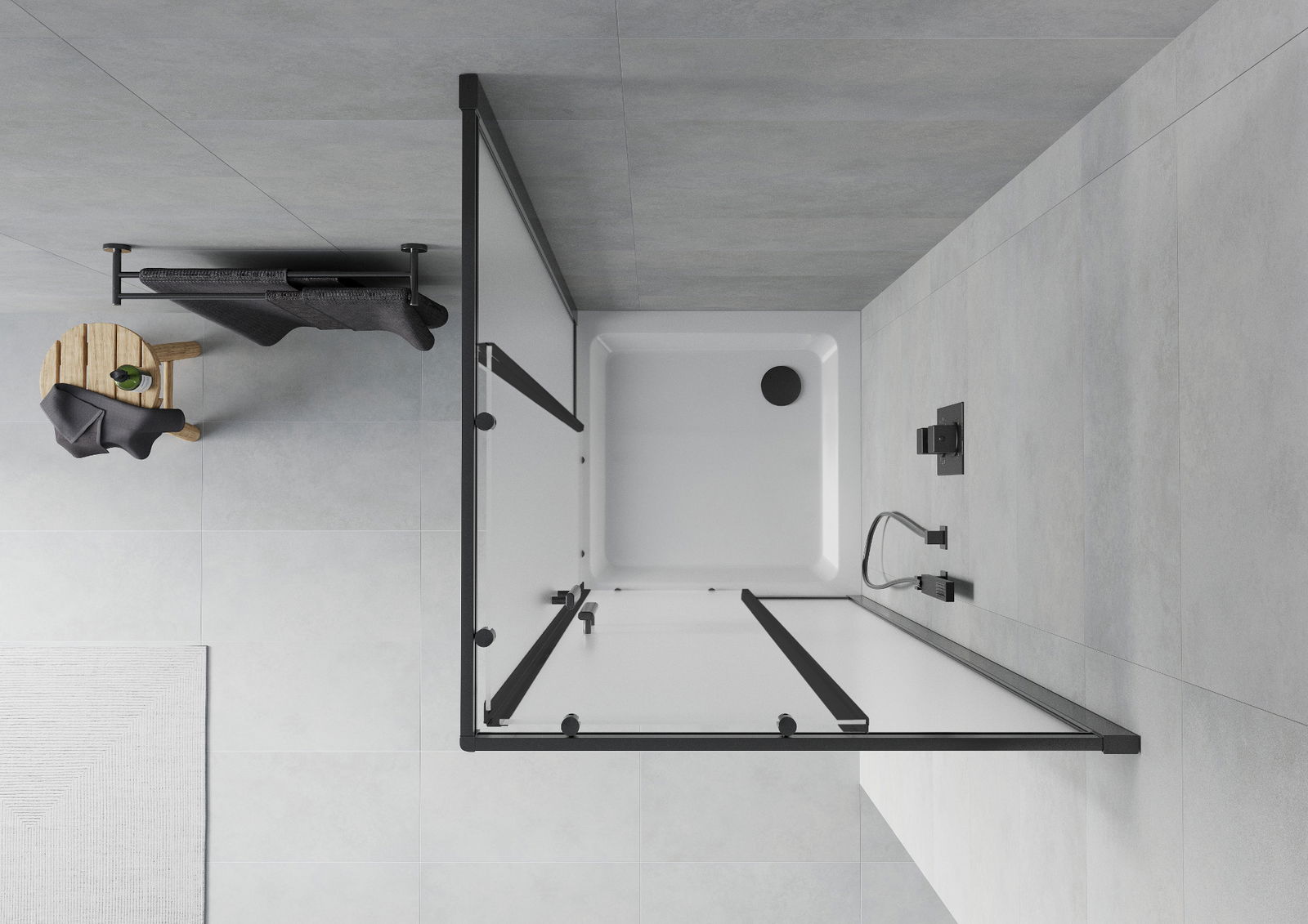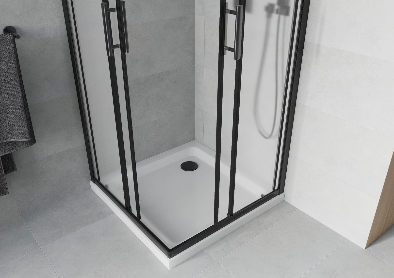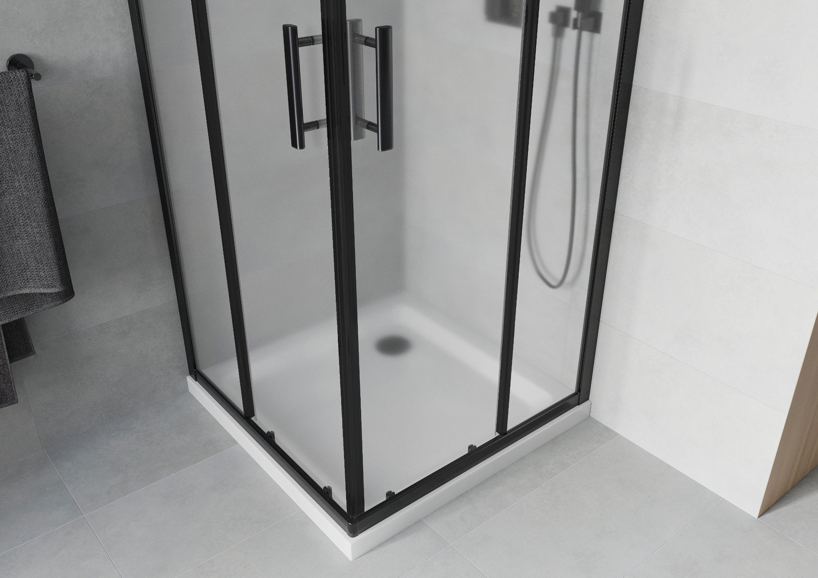 La poignée pratique et confortable est fabriquée en métal durable et résistant. Sa forme élégante, associée à une finition assortie à la couleur des profilés, confère à l'ensemble un style moderne et élégant, soulignant l'esthétique de chaque salle de bains.