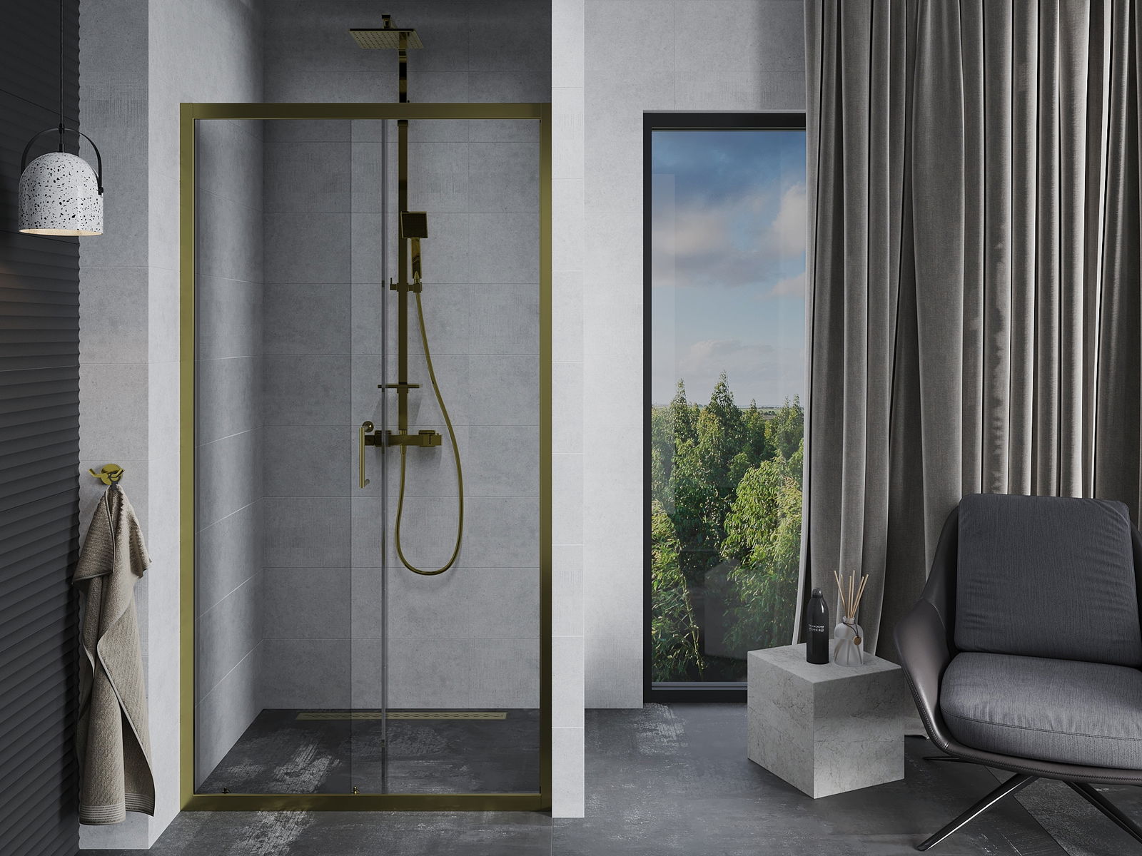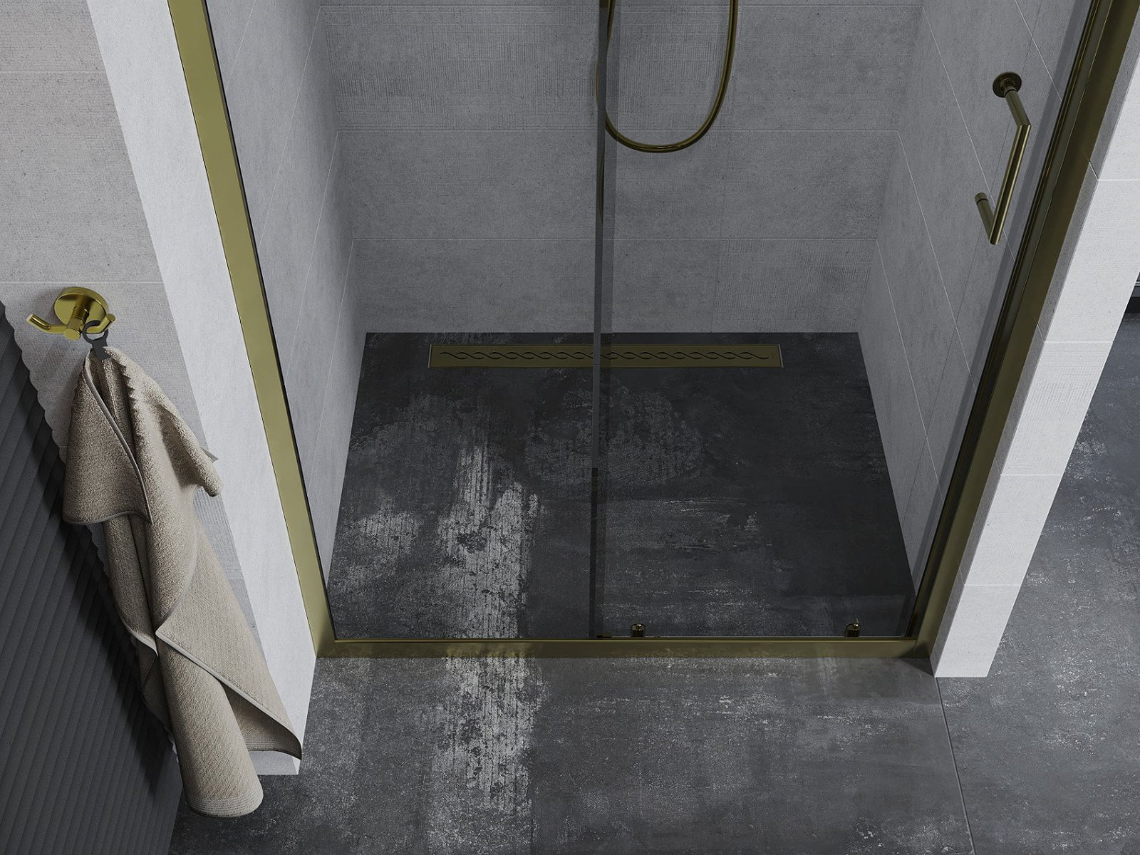 La poignée pratique et confortable est fabriquée en métal durable et résistant. Sa forme élégante, associée à une finition assortie à la couleur des profilés, confère à l'ensemble un style moderne et élégant, soulignant l'esthétique de chaque salle de bains.