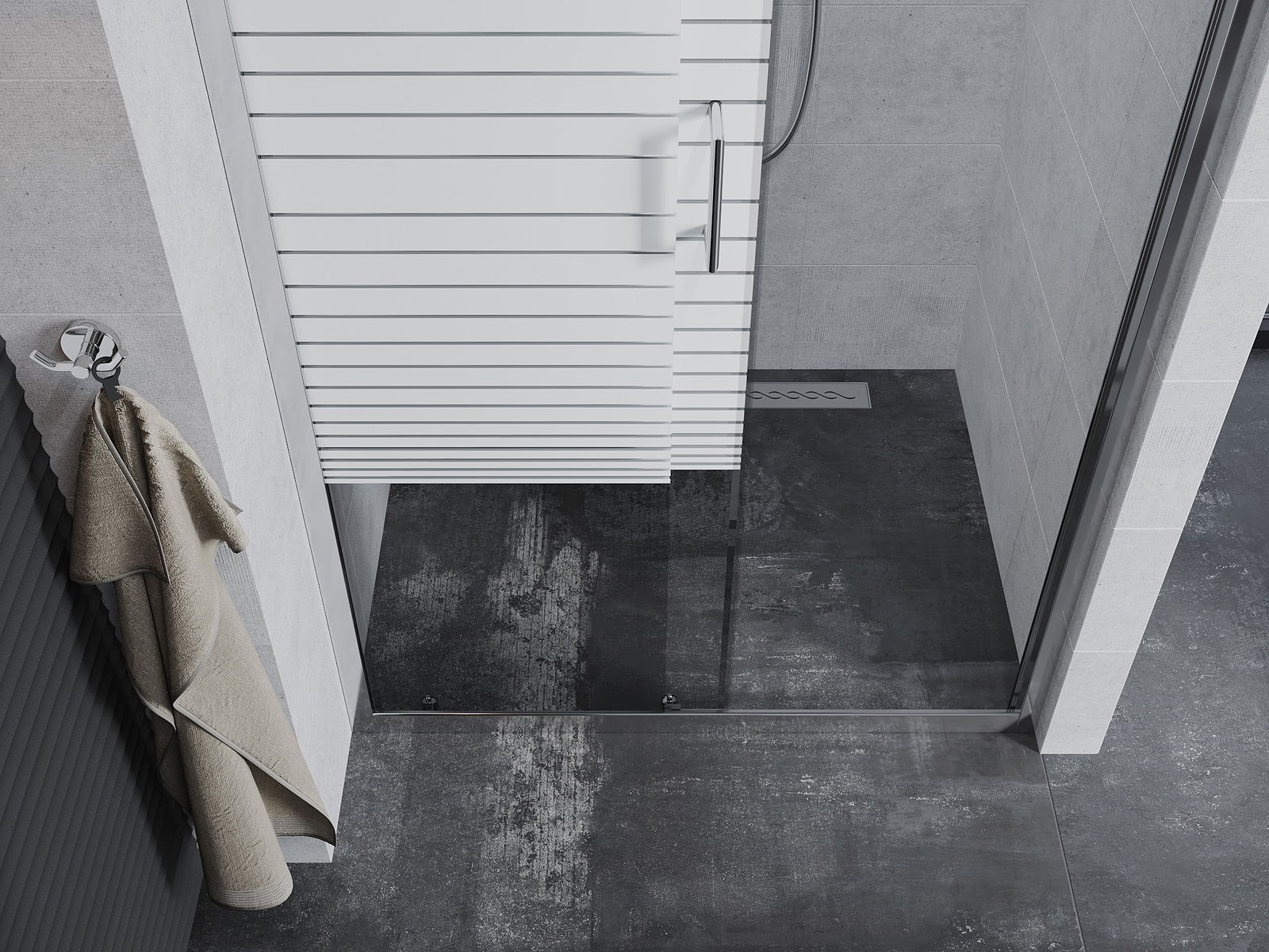 La poignée pratique et confortable est fabriquée en métal durable et résistant. Sa forme élégante, associée à une finition assortie à la couleur des profilés, confère à l'ensemble un style moderne et élégant, soulignant l'esthétique de chaque salle de bains.