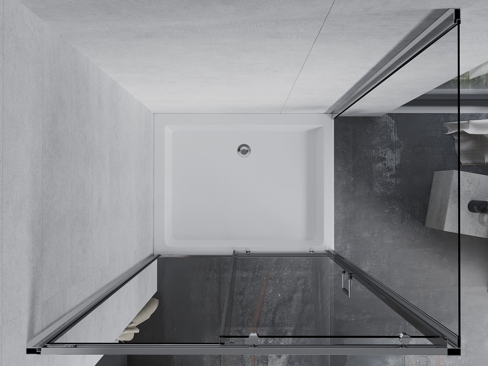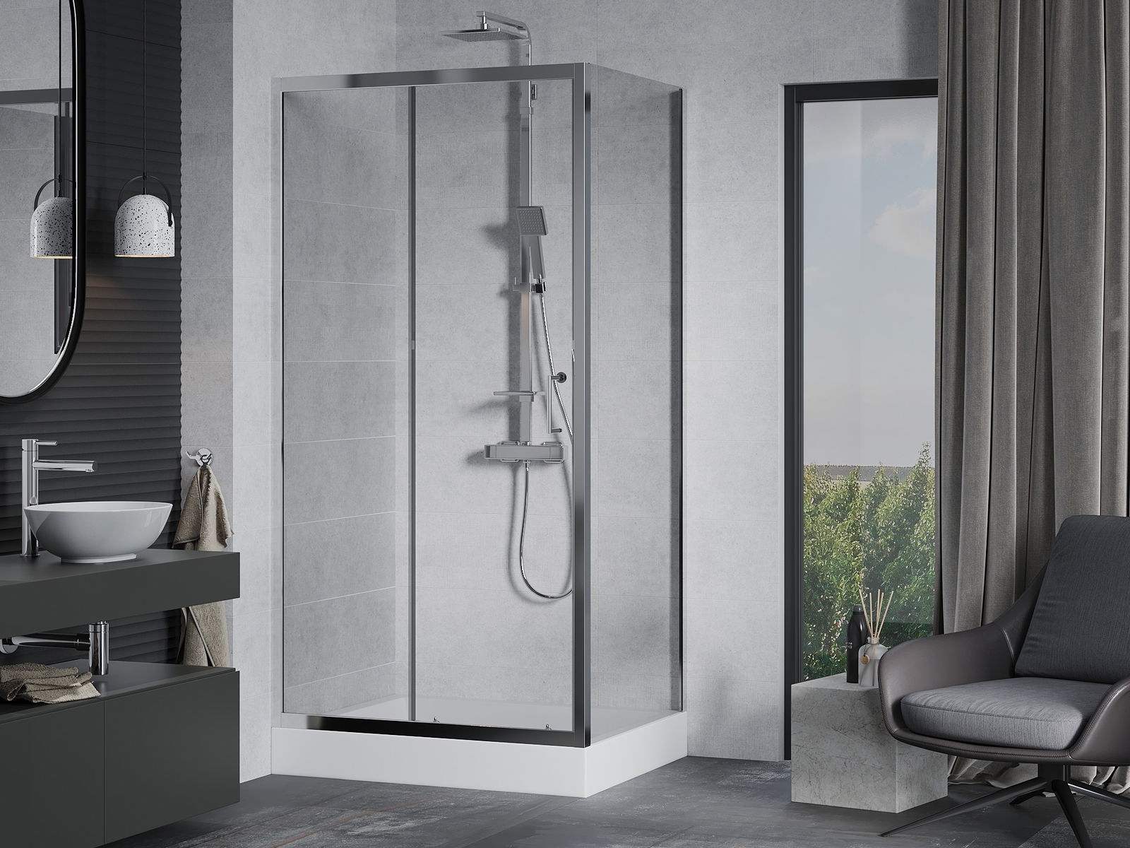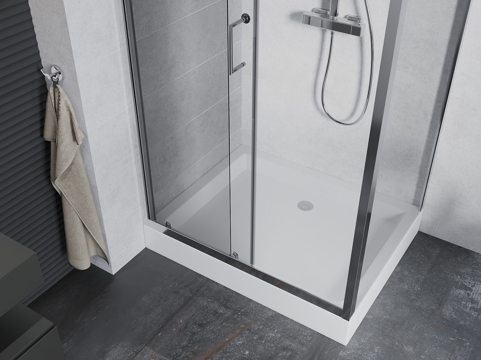 La poignée pratique et confortable est fabriquée en métal durable et résistant. Sa forme élégante, associée à une finition assortie à la couleur des profilés, confère à l'ensemble un style moderne et élégant, soulignant l'esthétique de chaque salle de bains.