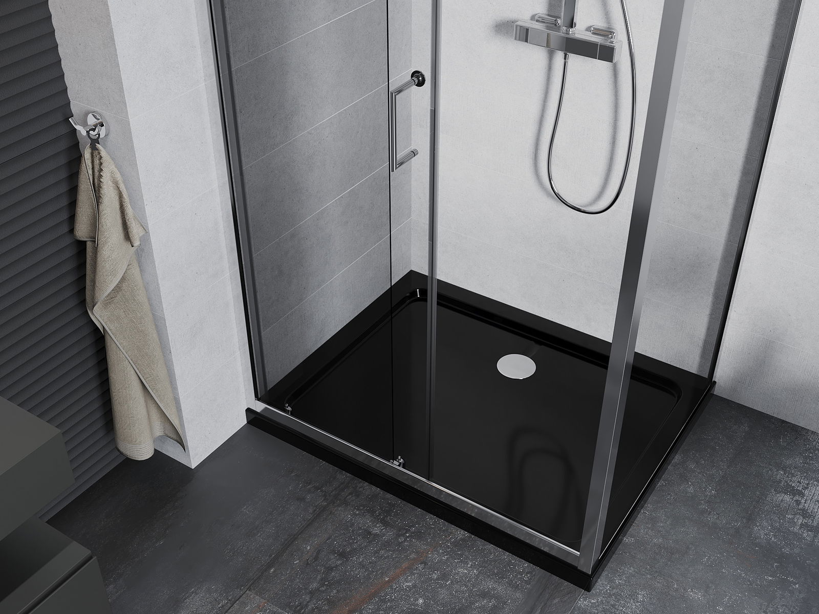 La poignée pratique et confortable est fabriquée en métal durable et résistant. Sa forme à la mode, combinée à une finition assortie à la couleur des profilés, donne à l'ensemble un aspect moderne et stylé, soulignant l'esthétique de chaque salle de bain.