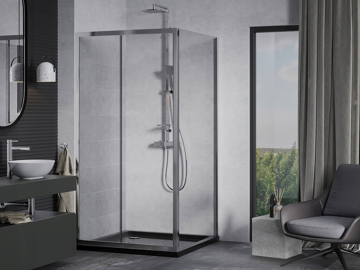 Cabine de douche coulissante Mexen Apia 100 x 100 cm, transparente, chrome + receveur Flat, noir - 840-100-100-01-00-4070