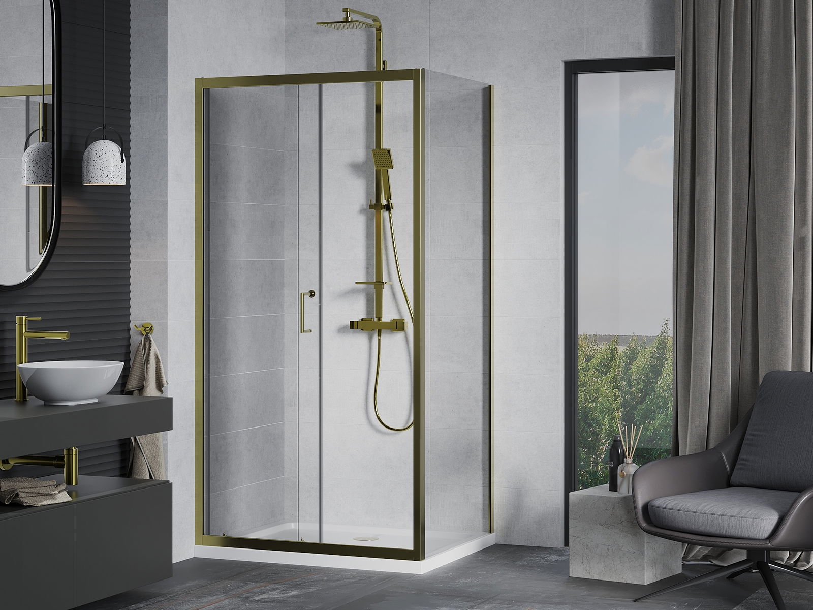Mexen Apia cabine de douche coulissante 130 x 70 cm, transparent, or + receveur Flat, blanc - 840-130-070-50-00-4010G