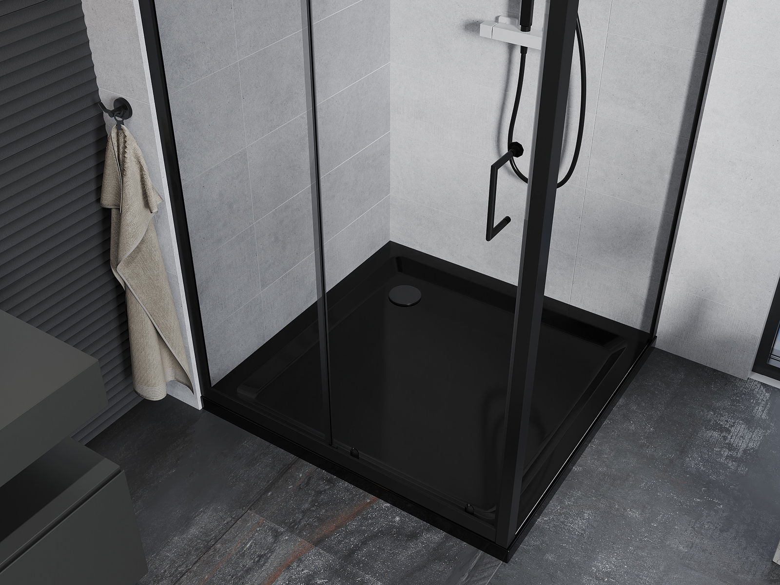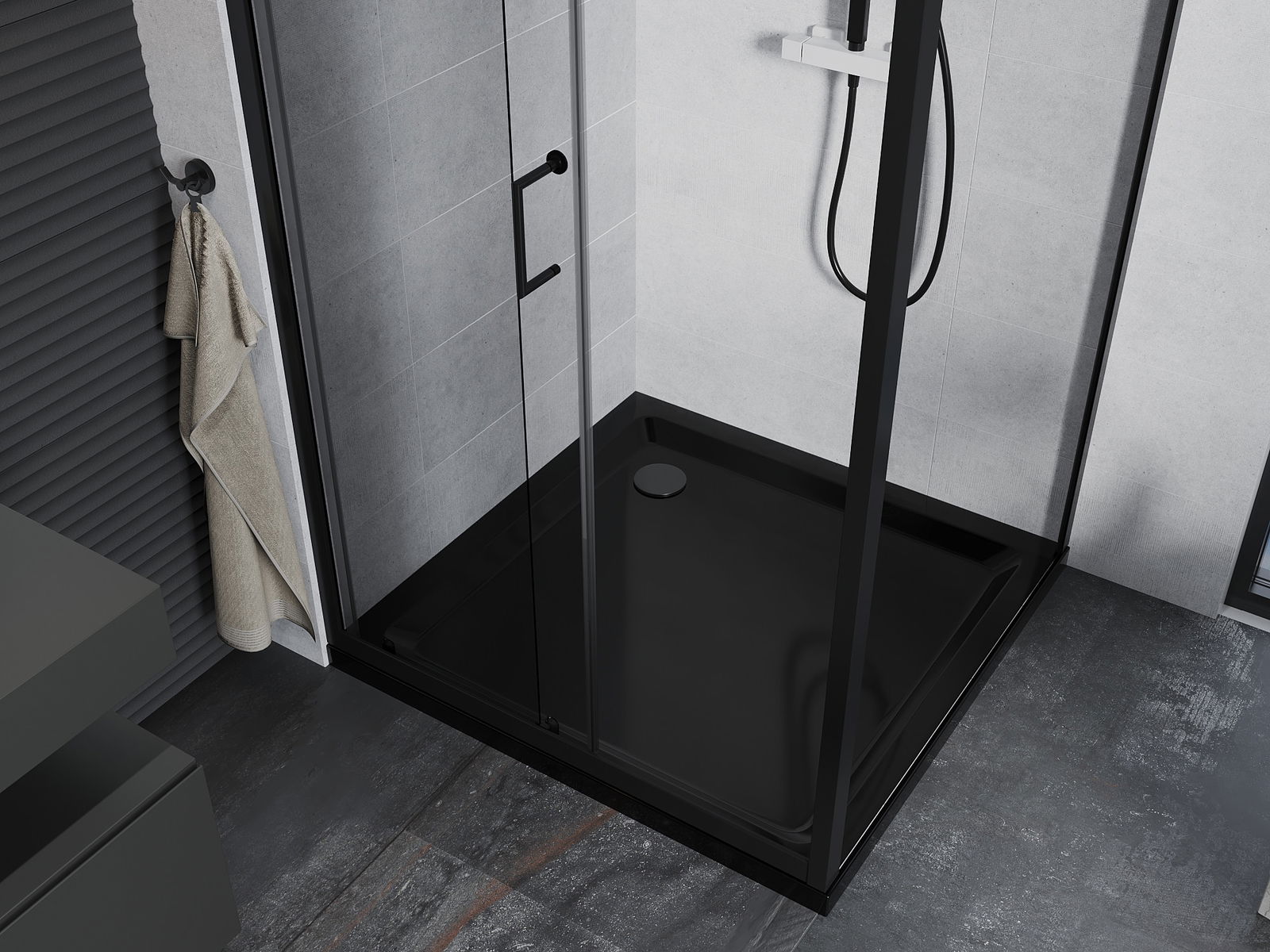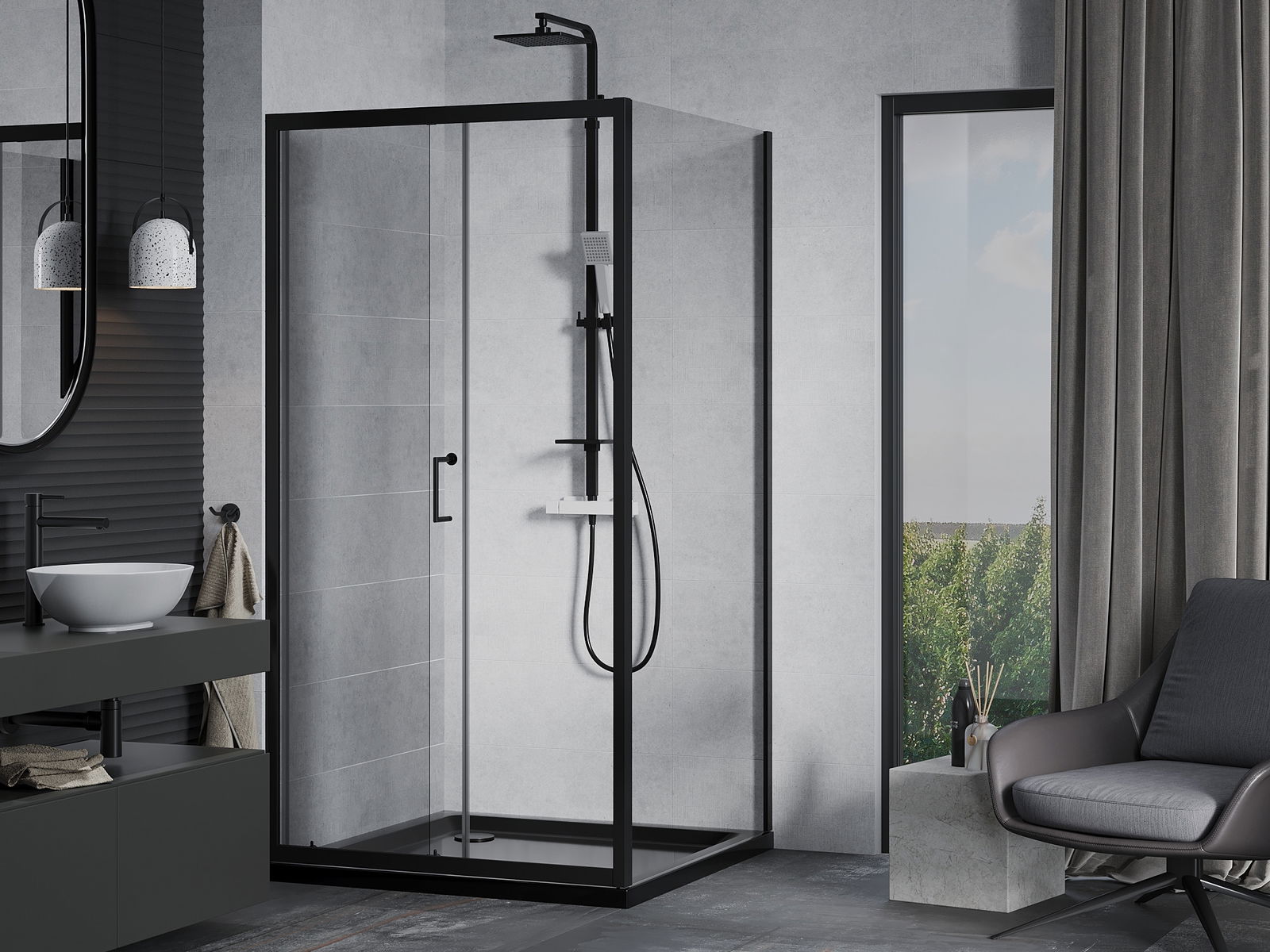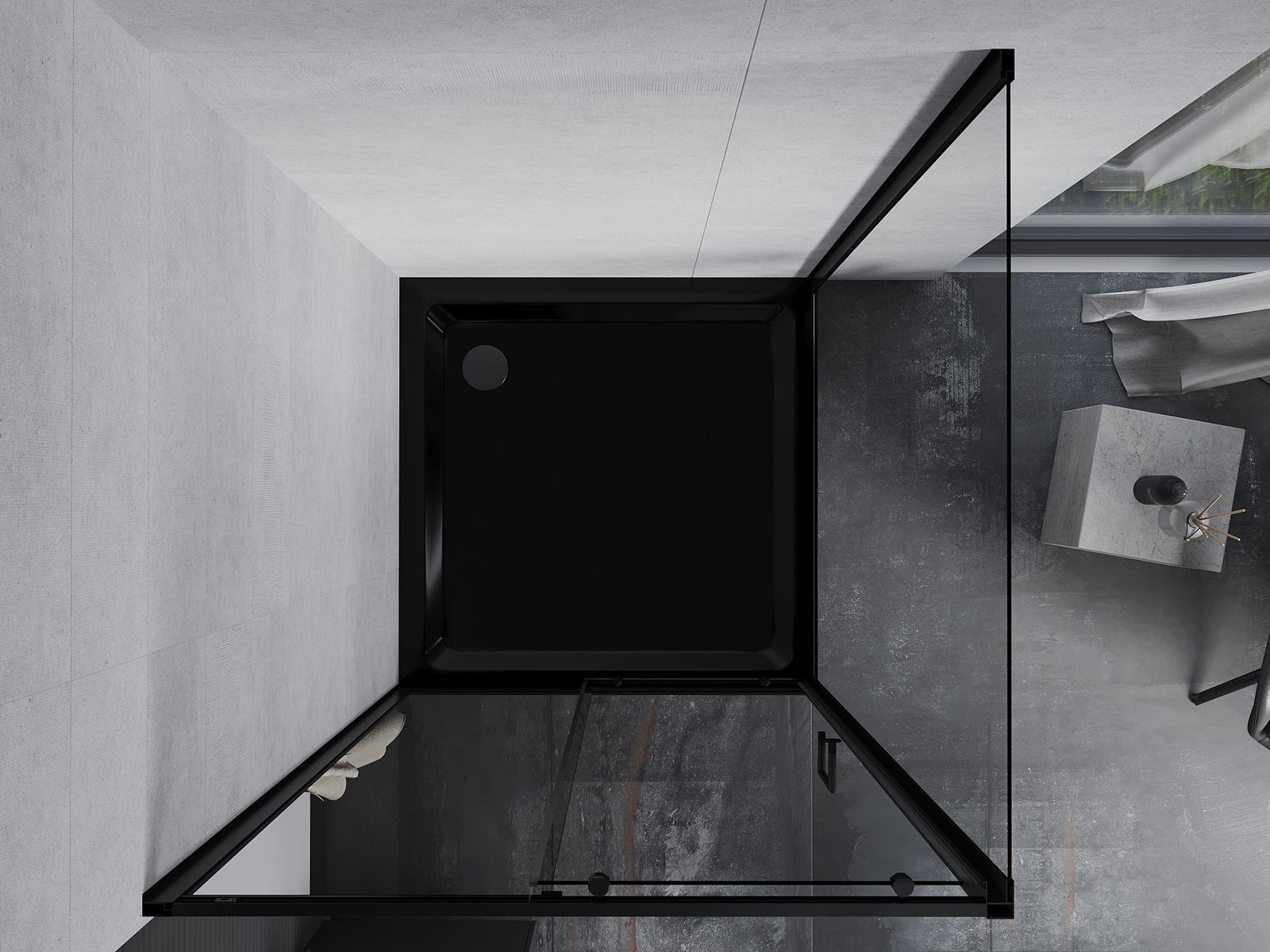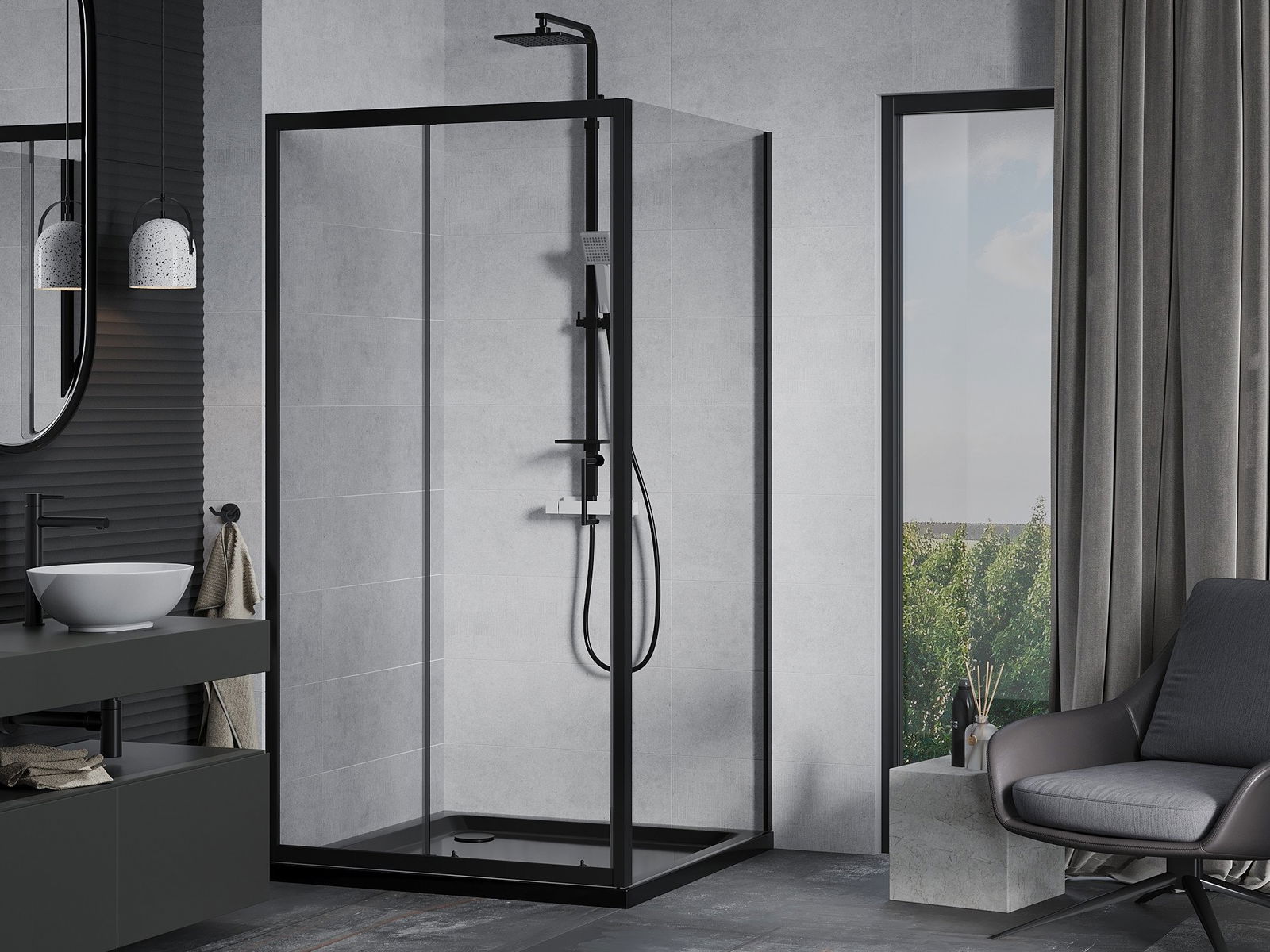 Cabine de douche coulissante Mexen Apia 90 x 90 cm, transparente, noire + receveur Flat, noir - 840-090-090-70-00-4070B