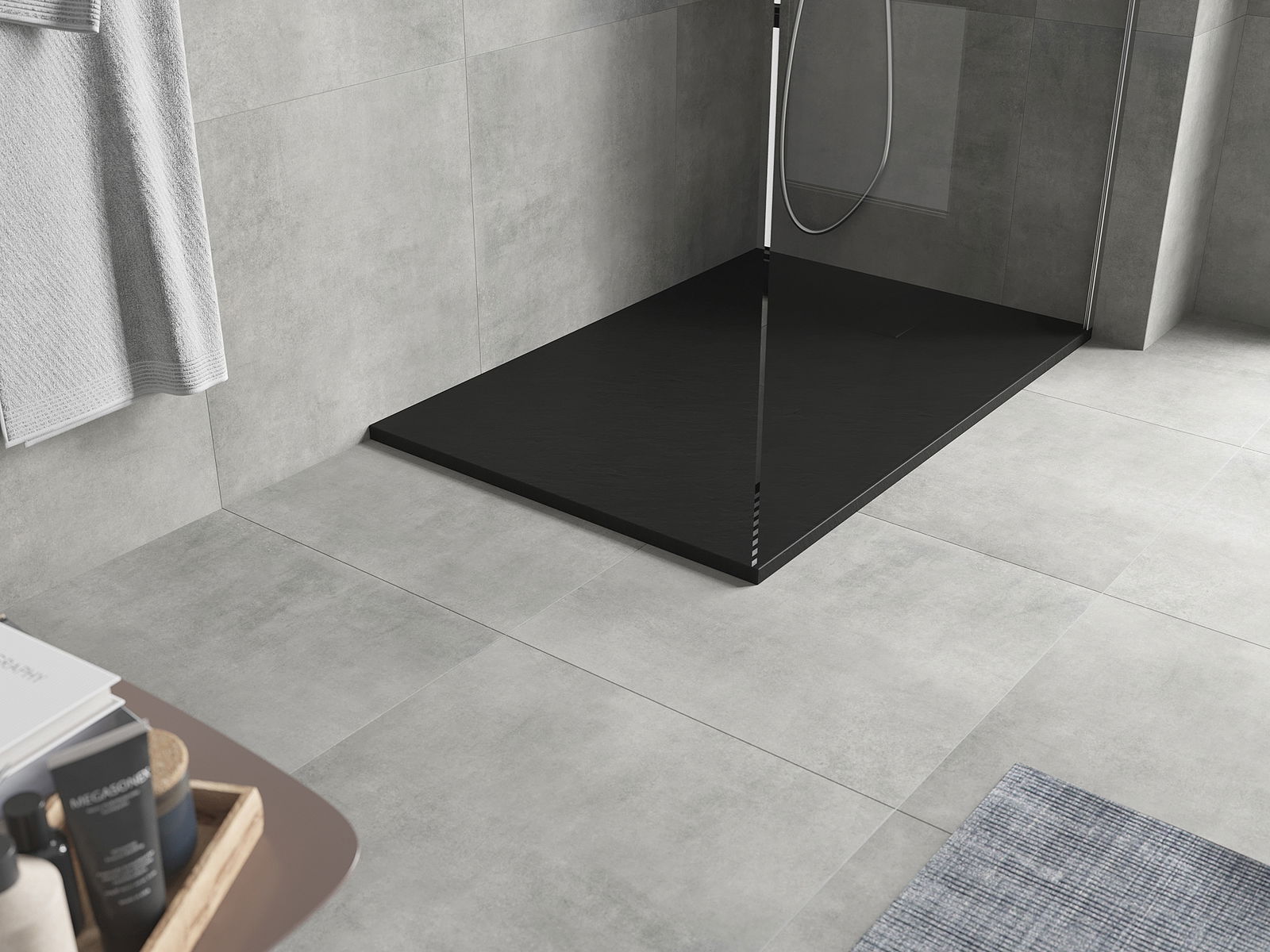 La surface du receveur de douche évoque la pierre. C'est une combinaison unique d'aspect naturel et de design intérieur moderne. Il ajoute du caractère, souligne l'esthétique et l'élégance de la salle de bains et séduit par sa forme.