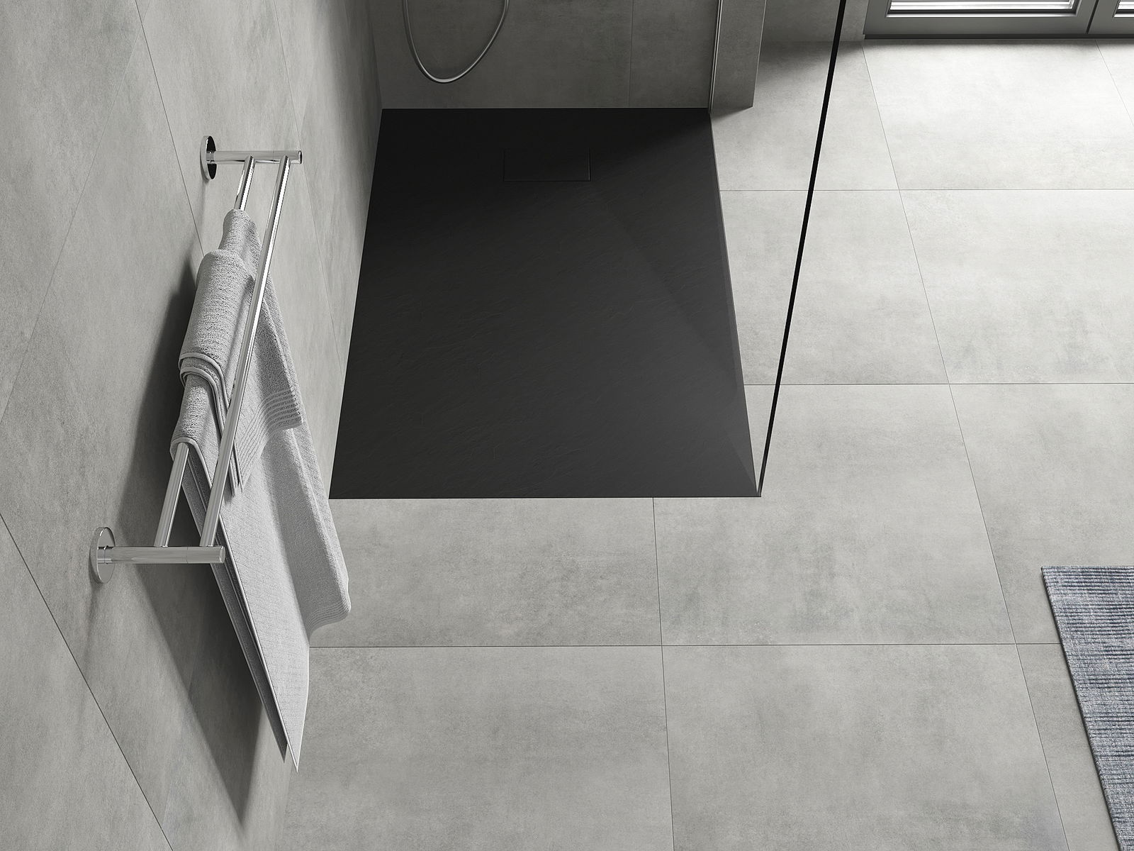 La surface du receveur de douche évoque la pierre. C'est une combinaison unique d'aspect naturel et de design intérieur moderne. Il ajoute du caractère, souligne l'esthétique et l'élégance de la salle de bains et séduit par sa forme.