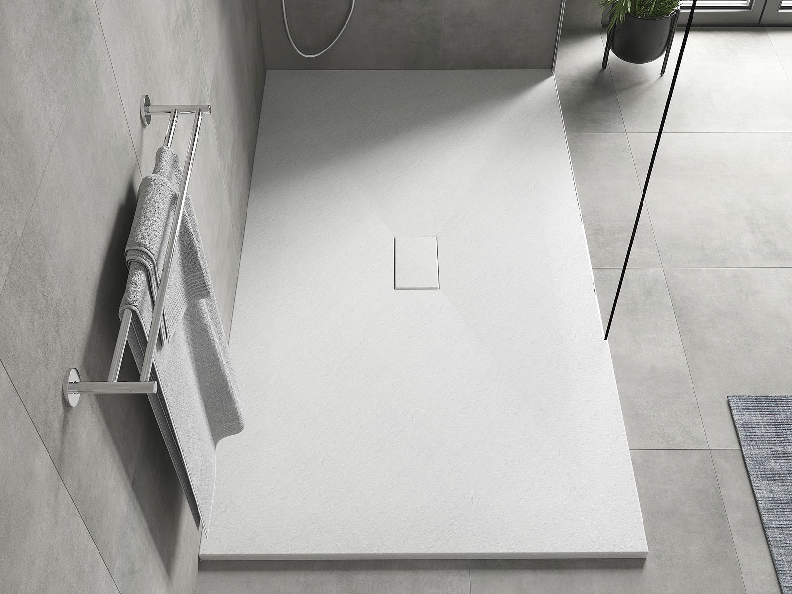 La surface du receveur de douche évoque la pierre. C'est une combinaison unique d'aspect naturel et de design intérieur moderne. Il ajoute du caractère, souligne l'esthétique et l'élégance de la salle de bains et séduit par sa forme.