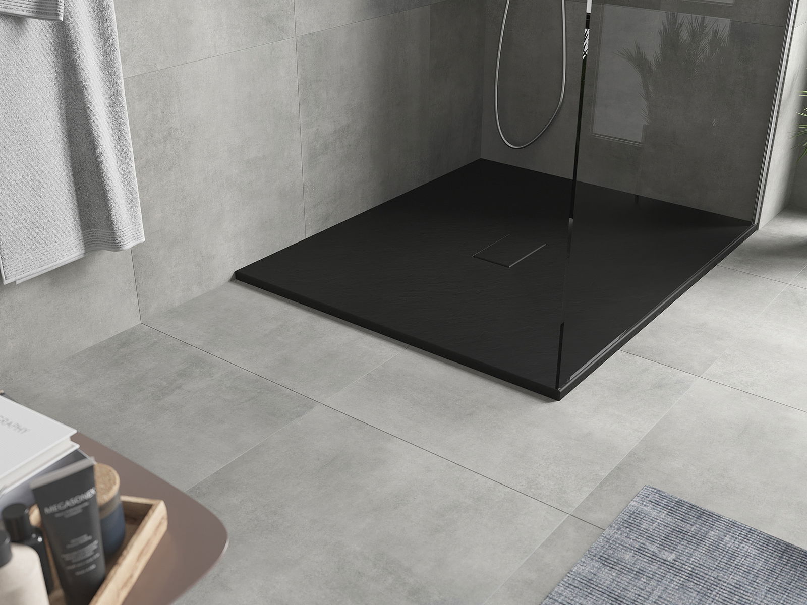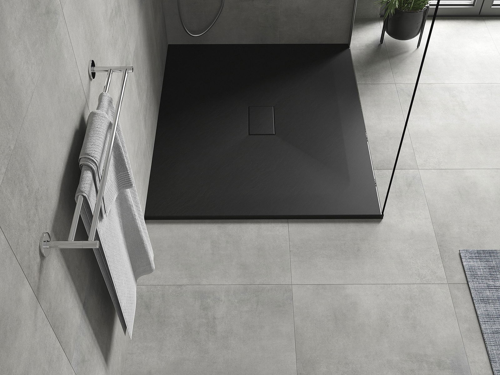 La surface du receveur de douche évoque la pierre. C'est une combinaison unique d'aspect naturel et de design intérieur moderne. Il ajoute du caractère, souligne l'esthétique et l'élégance de la salle de bains et séduit par sa forme.
