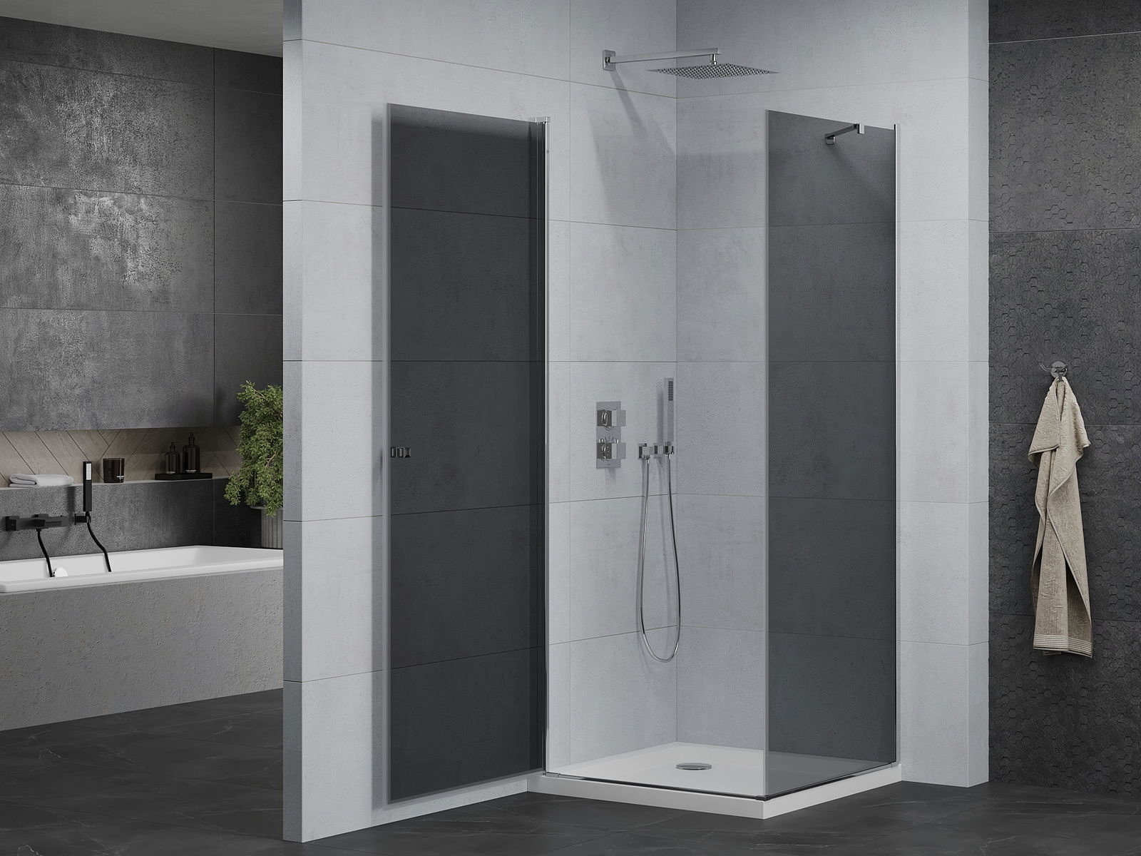 La poignée pratique et confortable est fabriquée en métal durable et résistant. Sa forme élégante, associée à une finition assortie à la couleur des profilés, confère à l'ensemble un style moderne et élégant, soulignant l'esthétique de chaque salle de bains.