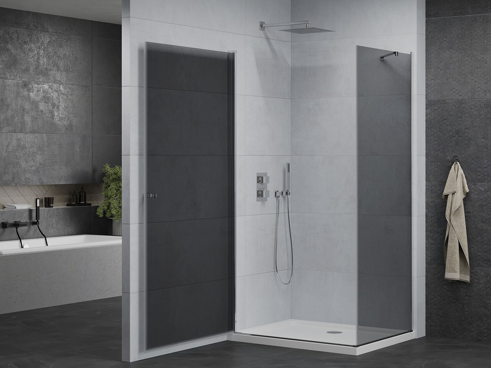 La poignée pratique et confortable est fabriquée en métal durable et résistant. Sa forme élégante, associée à une finition assortie à la couleur des profilés, confère à l'ensemble un style moderne et élégant, soulignant l'esthétique de chaque salle de bains.