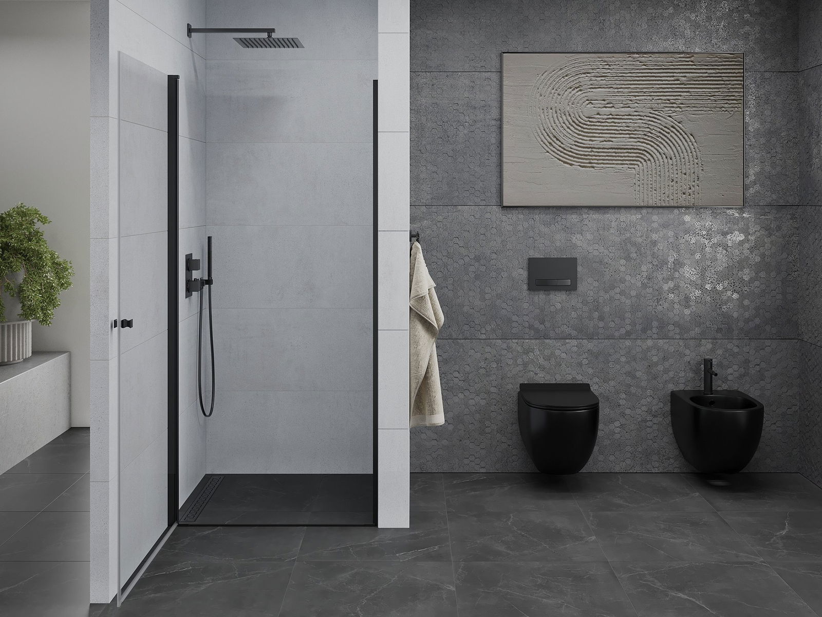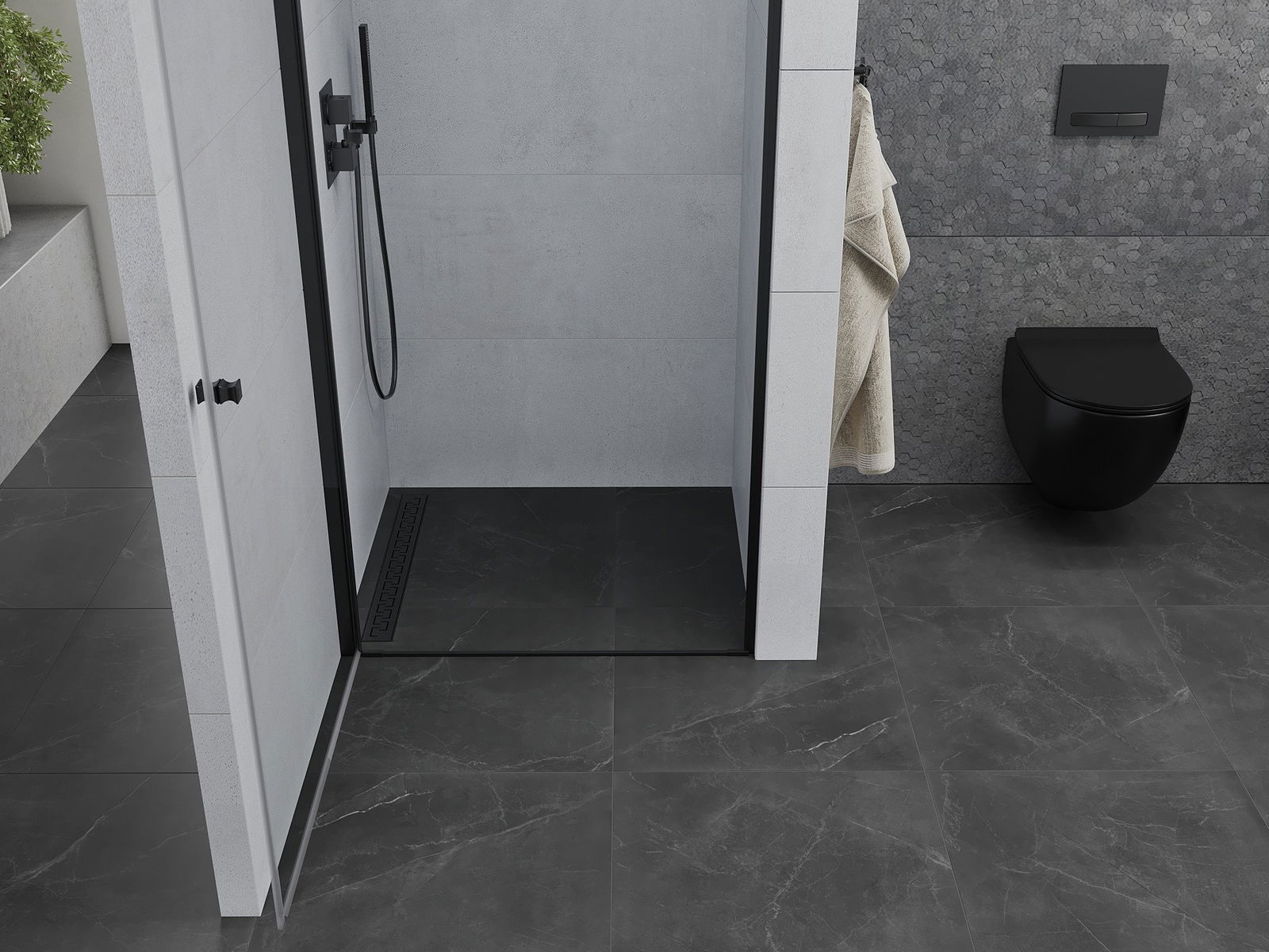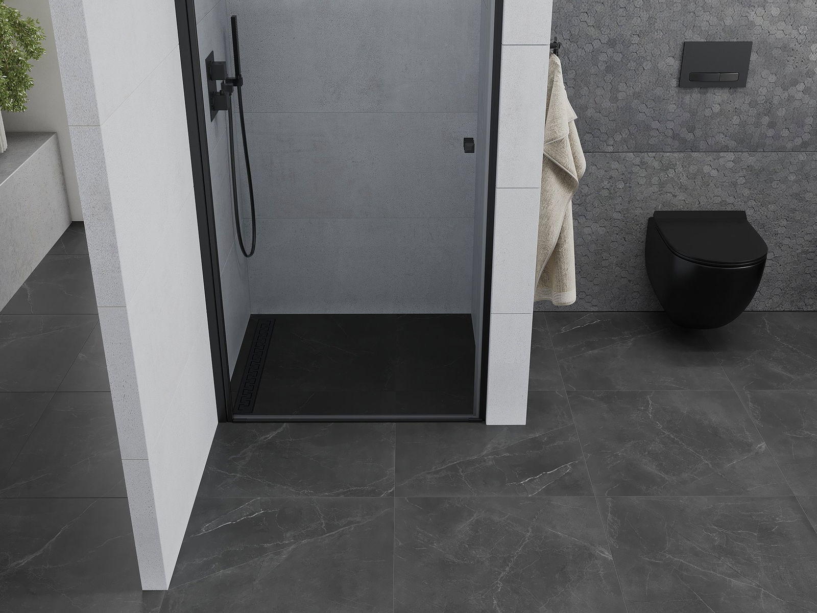 La poignée pratique et confortable est fabriquée en métal durable et résistant. Sa forme élégante, associée à une finition assortie à la couleur des profilés, confère à l'ensemble un style moderne et élégant, soulignant l'esthétique de chaque salle de bains.