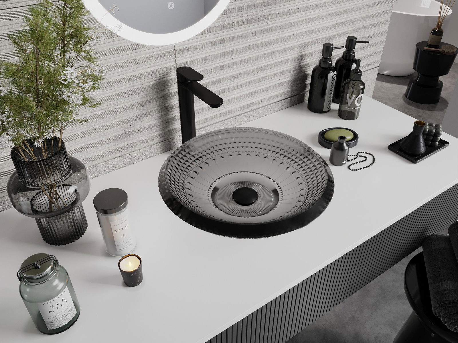Ce lavabo se distingue par sa structure cristalline unique, qui lui confère un aspect unique et extrêmement efficace. Les cristaux scintillent à la lumière, attirant le regard et apportant une touche d'élégance. Une solution pratique et élégante pour toute salle de bains.