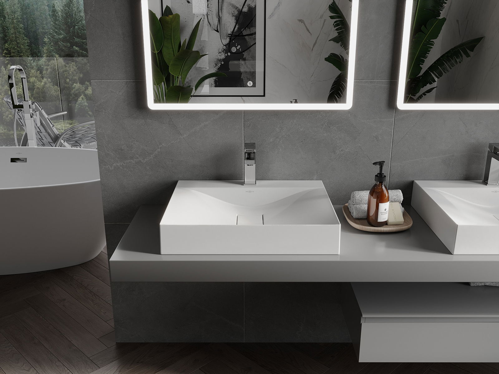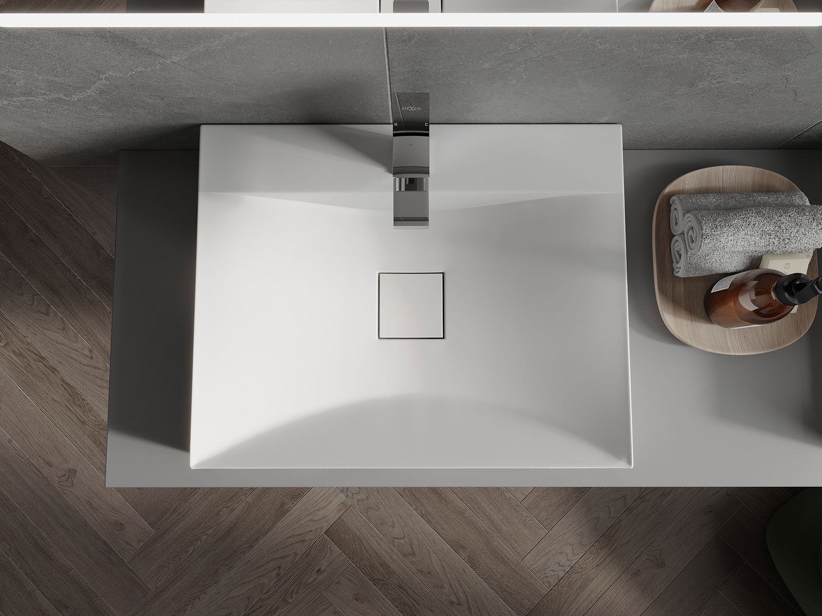 Le lavabo est doté d'un trou pour installer un robinet. Cela permet de gagner de la place dans la salle de bains et de mettre en valeur son esthétique. Cette solution facilite également la propreté des abords du lavabo.