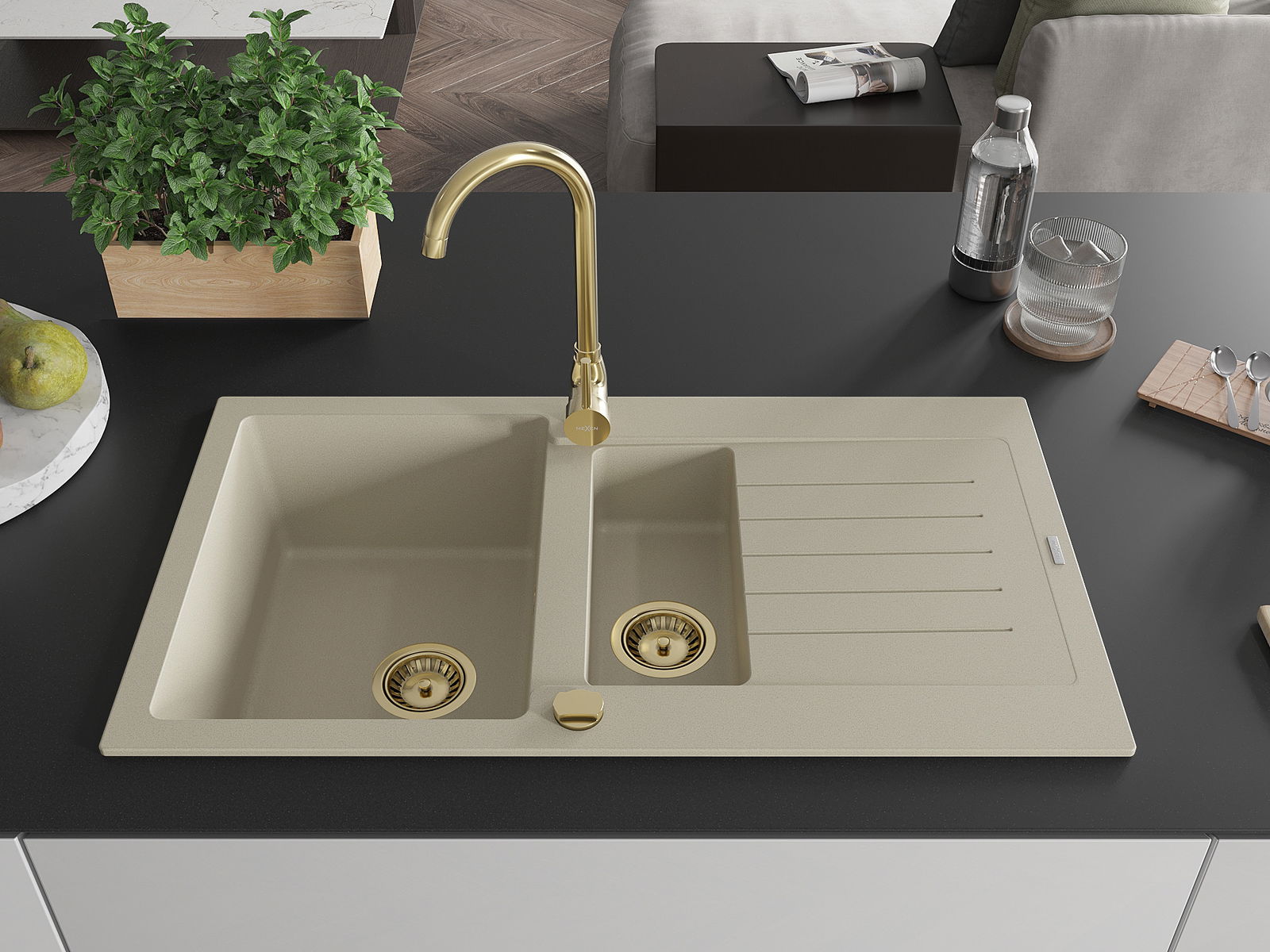 Mexen Matias évier en granit 1,5 bac avec égouttoir 900 x 505 mm, beige, siphon doré - 6502901505-69-G