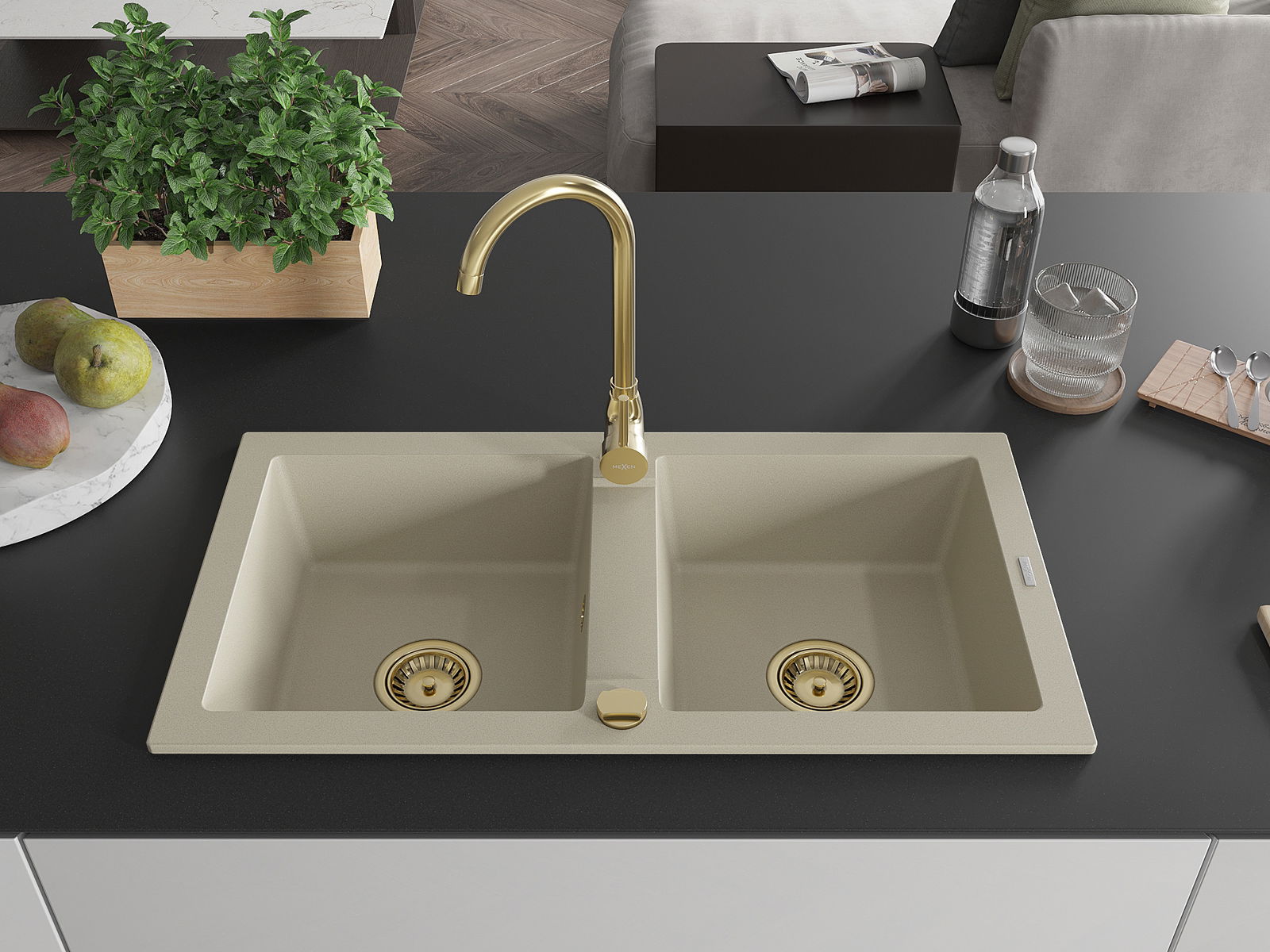Mexen Mario évier en granit 2 bacs 820 x 436 mm, beige, siphon doré - 6504822000-69-G