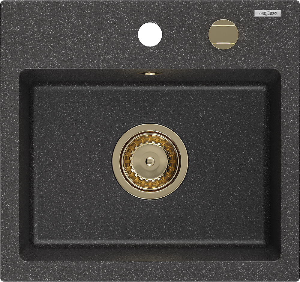 Mexen Milo évier en granit 1 bac 435 x 410 mm, noir moucheté, siphon doré - 6505441000-76-G