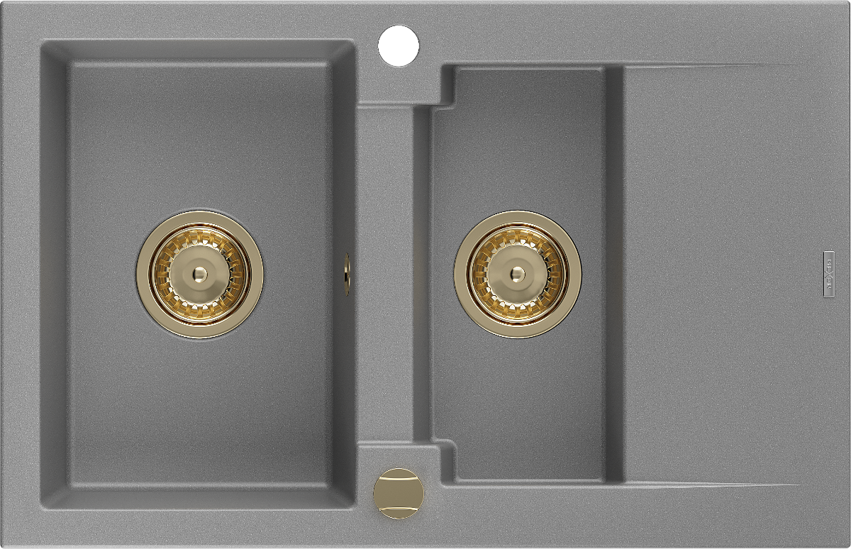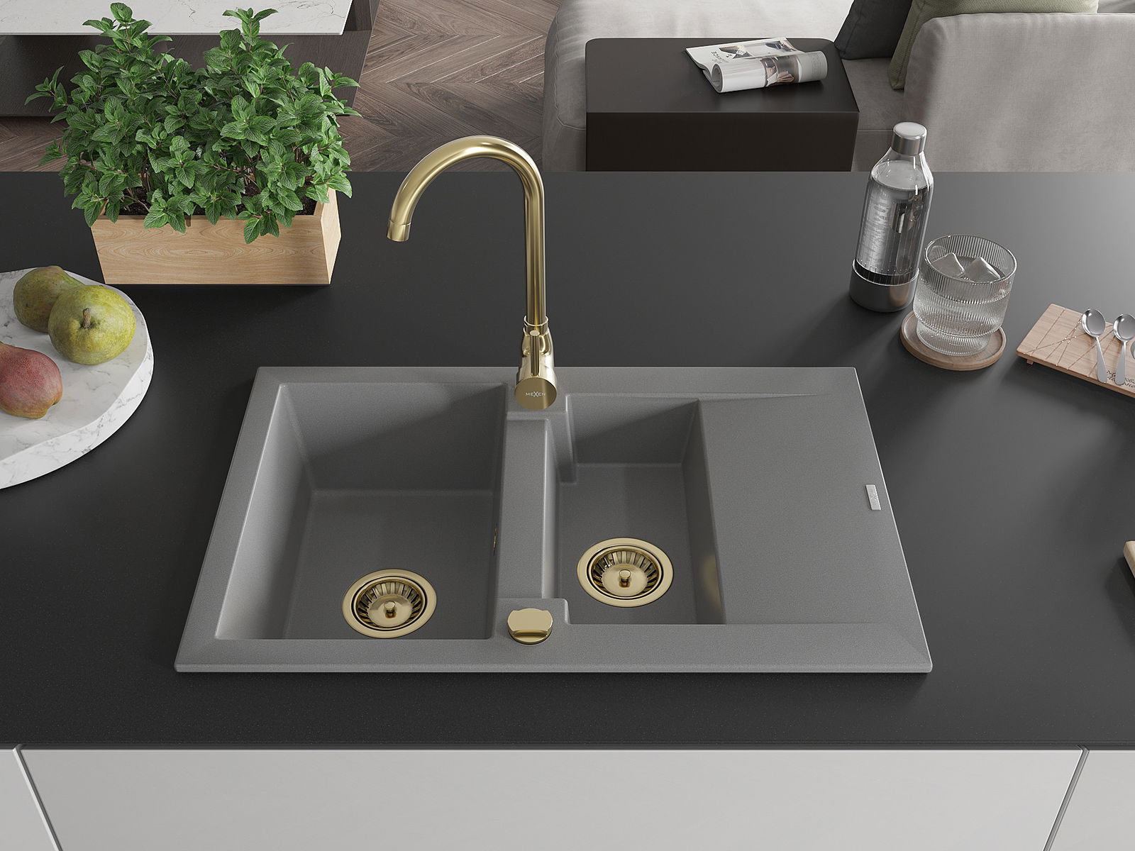 Mexen Gaspar évier en granit 1,5 bac avec égouttoir 737 x 475 mm, gris, siphon doré - 6507731505-71-G