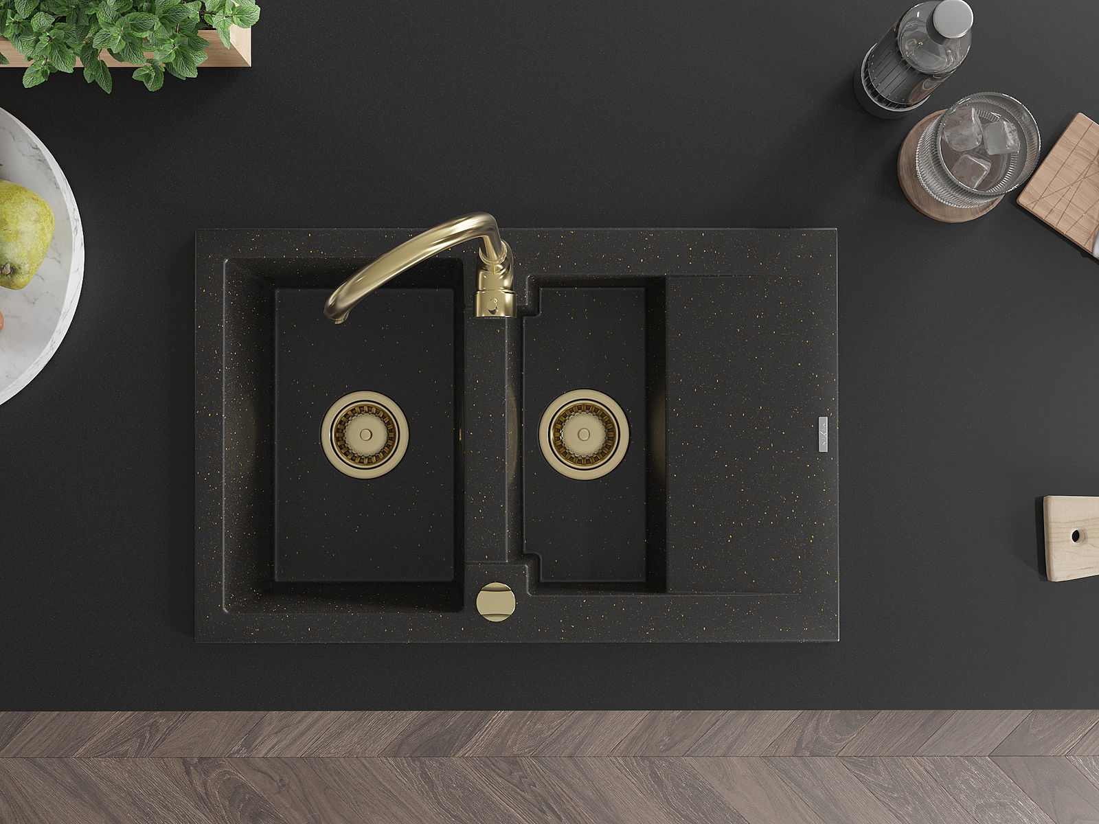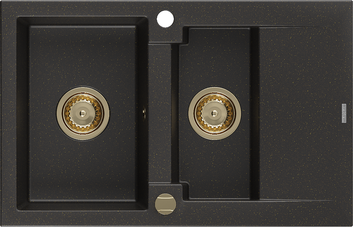 Mexen Gaspar évier en granit 1,5 bac avec égouttoir 737 x 475 mm, noir/métallisé doré, siphon doré - 6507731505-75-G