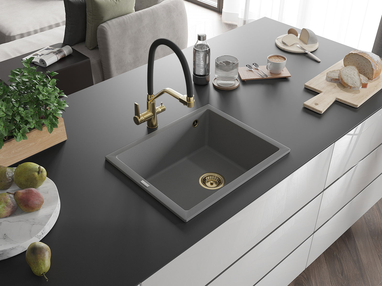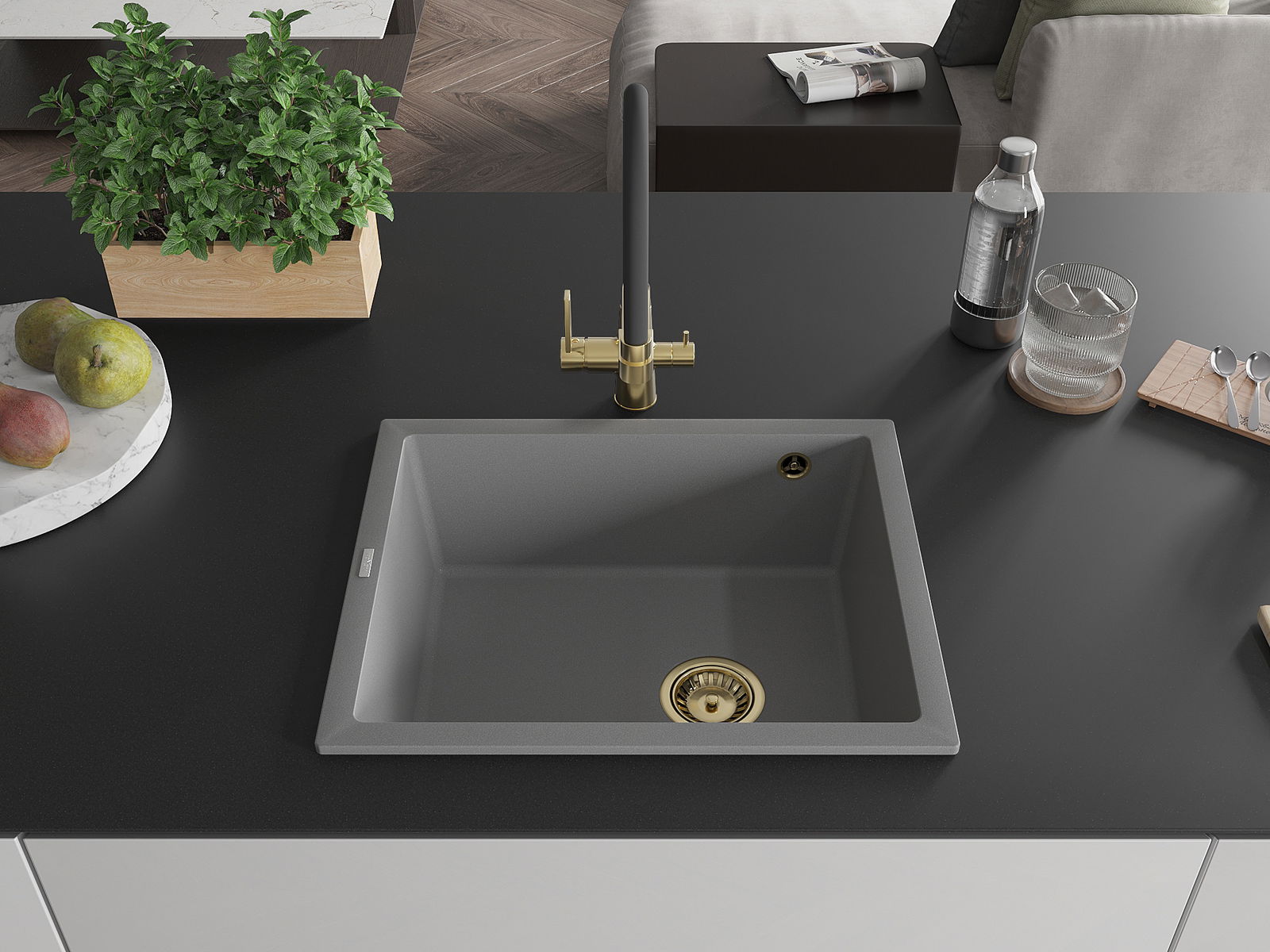 Mexen Pedro évier en granit 1 bac 560 x 460 mm, gris, siphon doré - 6508561000-71-G