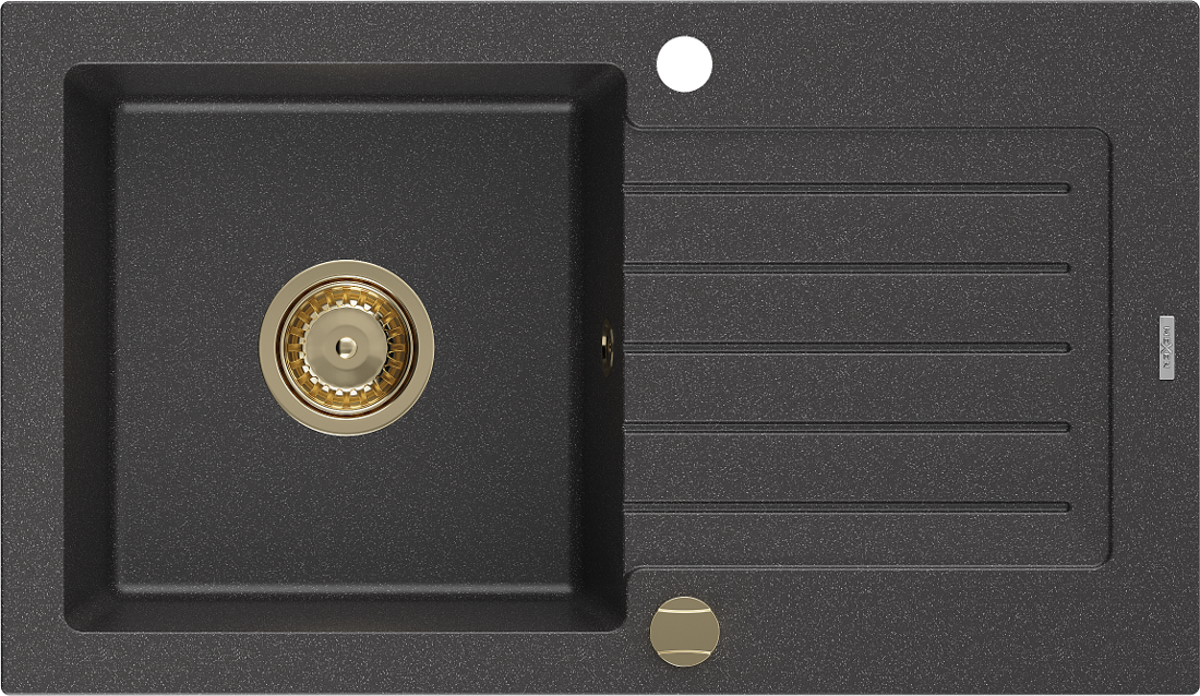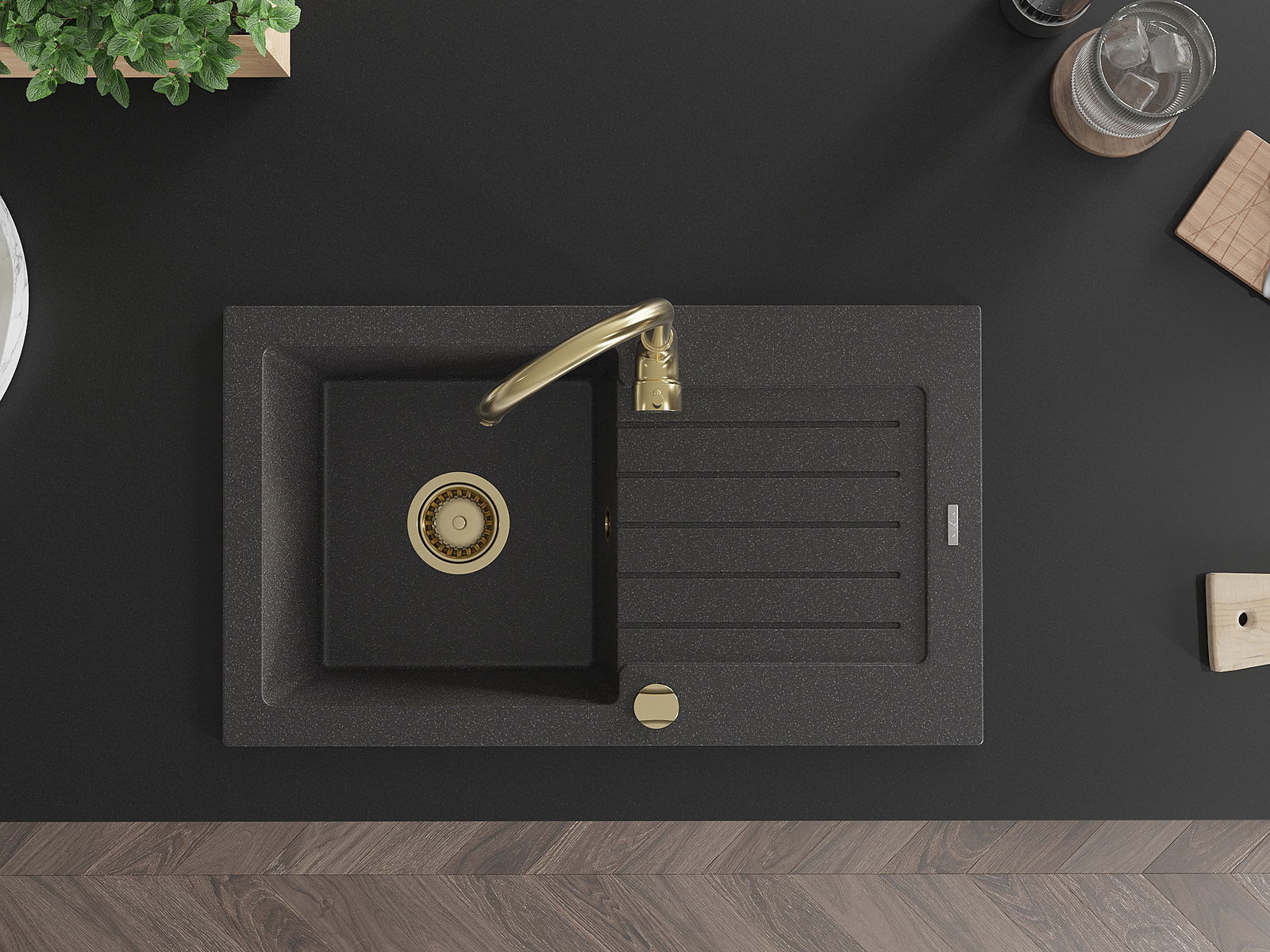 Mexen Pablo évier de cuisine en granit 1 bac avec égouttoir 752 x 436 mm, noir moucheté, siphon doré - 6510751010-76-G