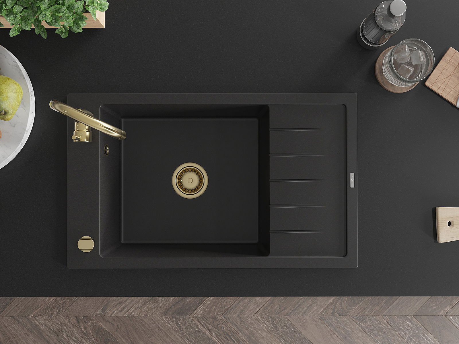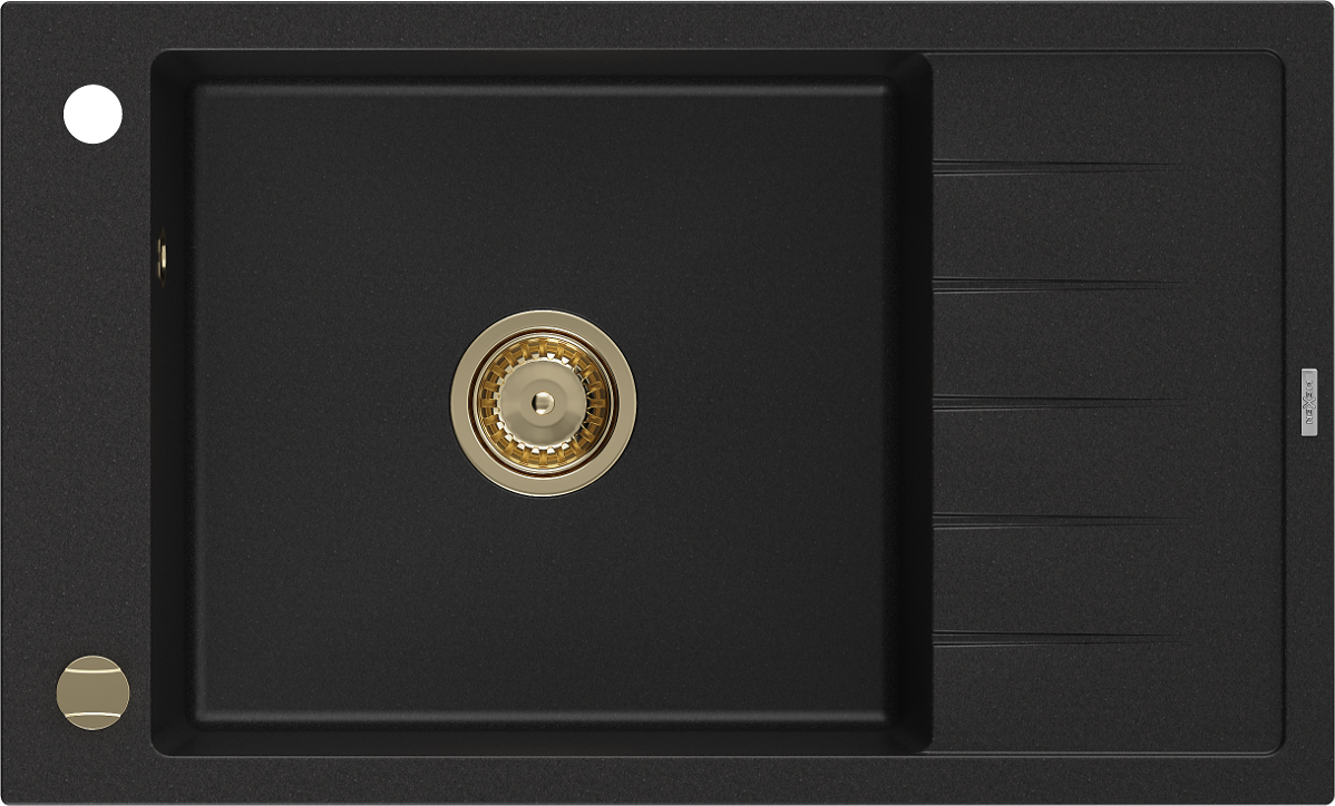 Mexen Elias évier en granit à 1 bac avec égouttoir 795 x 480 mm, noir, siphon doré - 6511791005-77-G