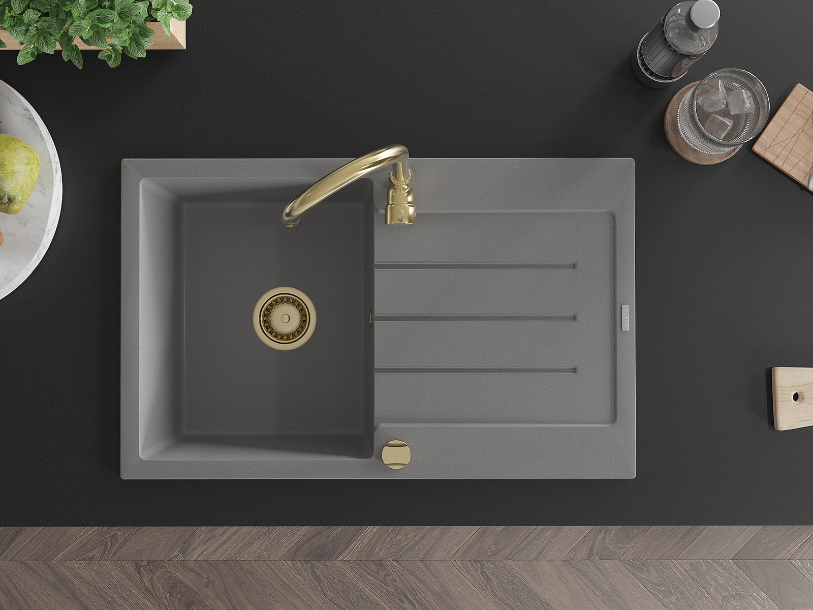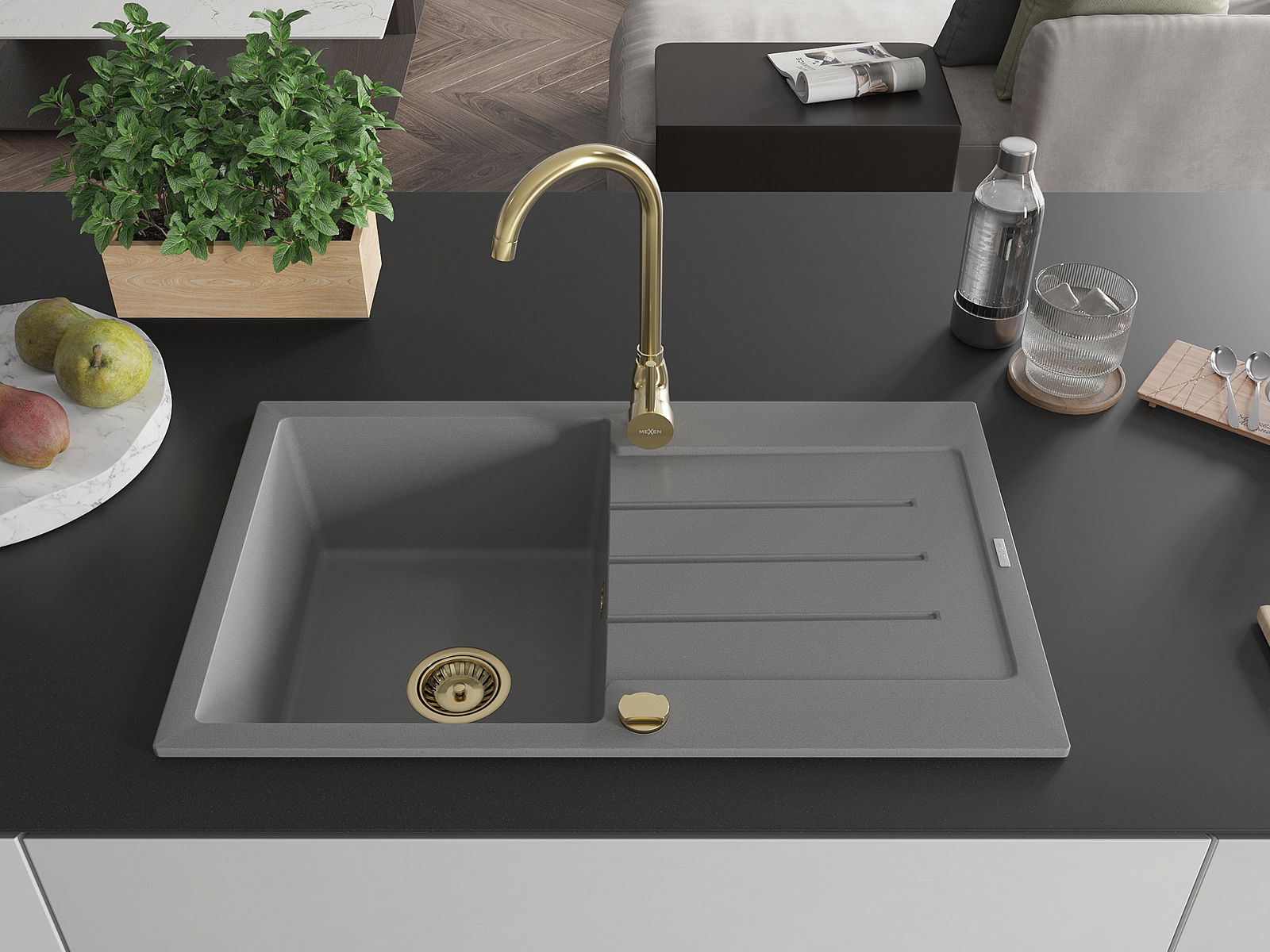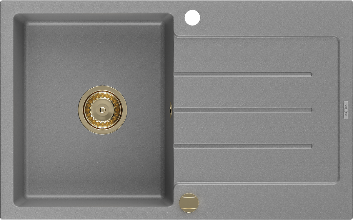 Mexen Bruno évier granitique 1-bac avec égouttoir 795 x 495 mm, gris, siphon doré - 6513791010-71-G