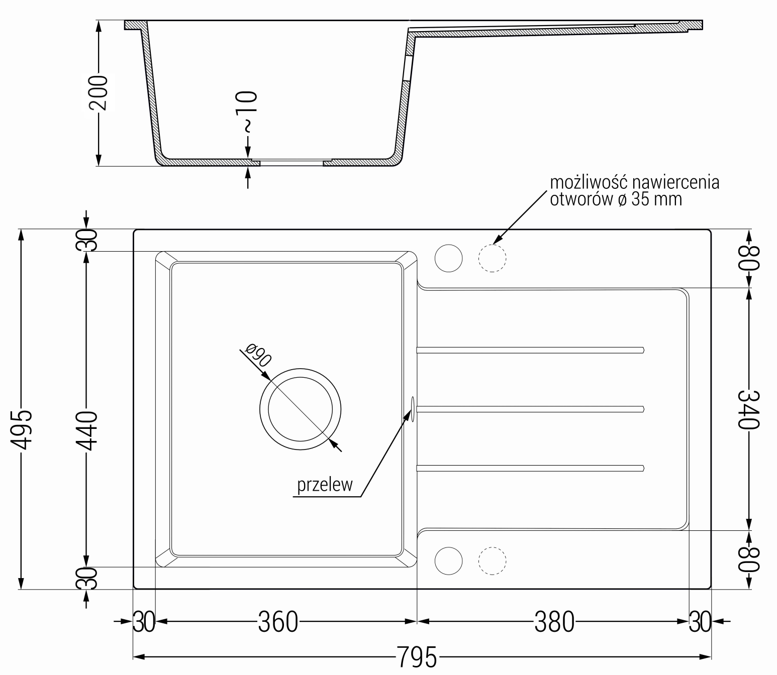L'évier est doté de deux trous fraisés de 35 mm de diamètre, auto-perforables. Ils permettent notamment d'installer un distributeur de liquide, ce qui éliminera les bouteilles en plastique dans la cuisine et lui apportera une finition élégante.