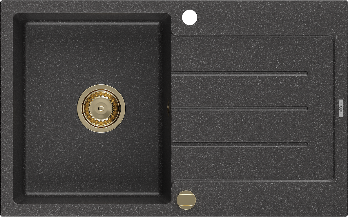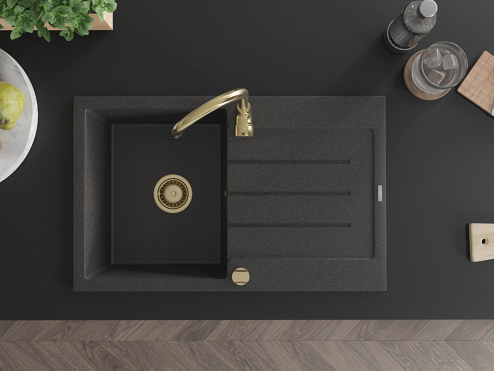 Mexen Bruno évier en granit 1 bac avec égouttoir 795 x 495 mm, noir moucheté, siphon doré - 6513791010-76-G
