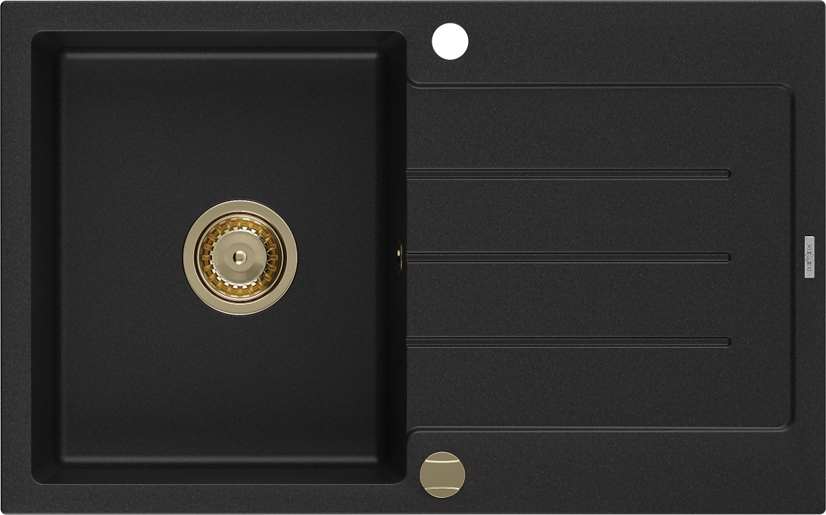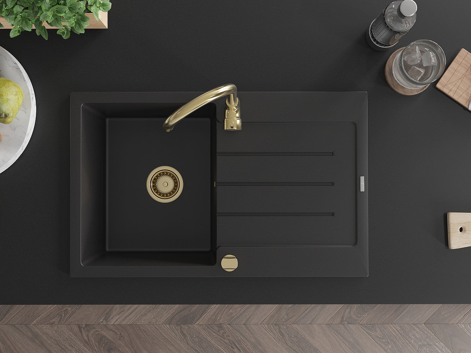 Mexen Bruno évier en granit 1 bac avec égouttoir 795 x 495 mm, noir, siphon doré - 6513791010-77-G
