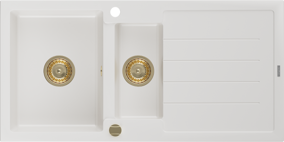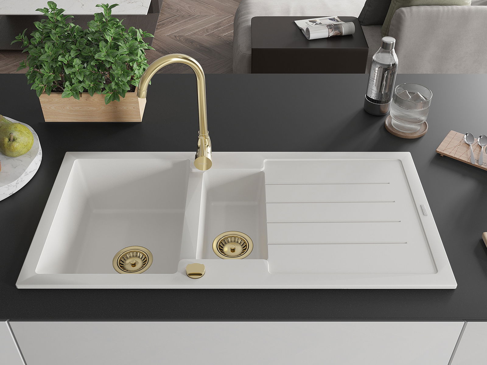 Mexen Andres évier en granit 1,5 bac avec égouttoir 1000 x 500 mm, blanc, siphon doré - 6515101510-20-G