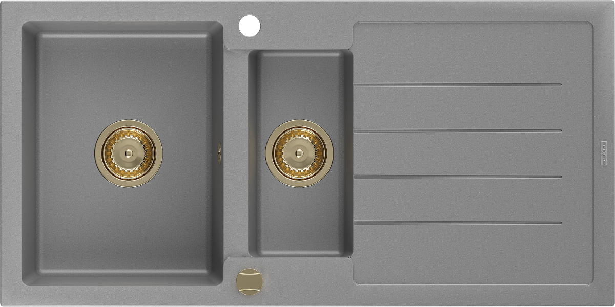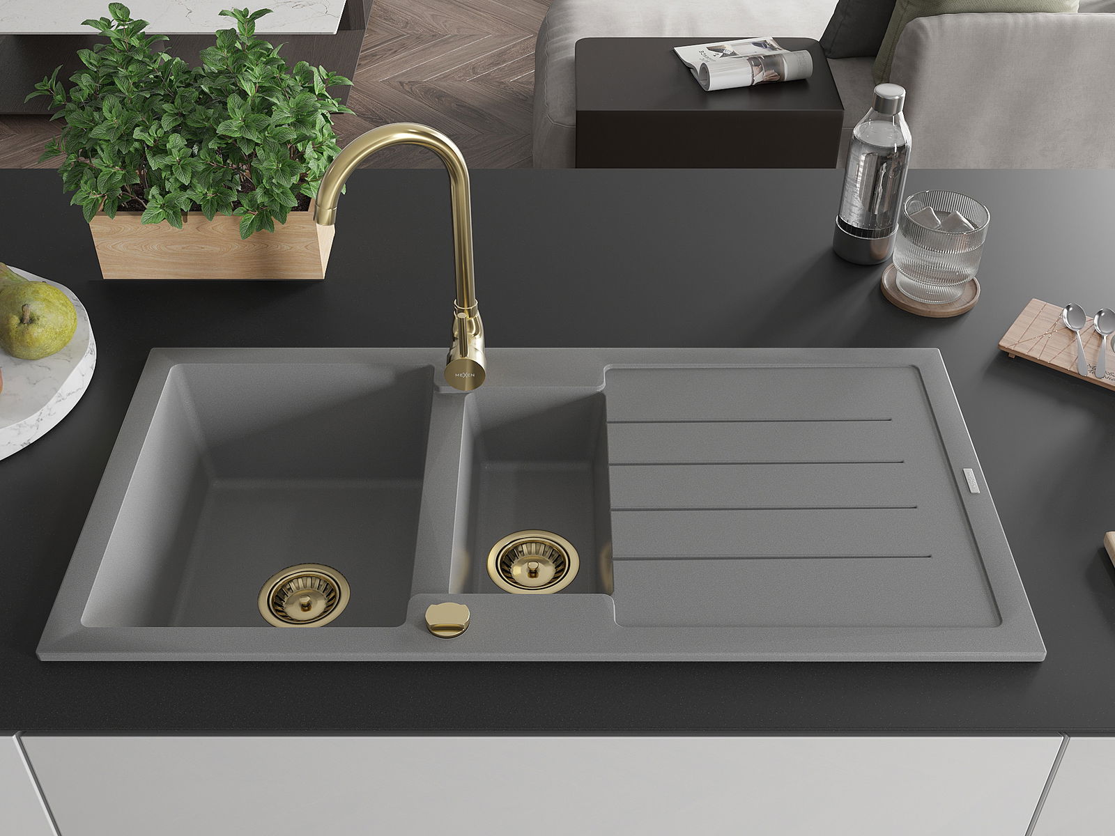 Mexen Andres évier en granit 1,5 bac avec égouttoir 1000 x 500 mm, gris, siphon doré - 6515101510-71-G