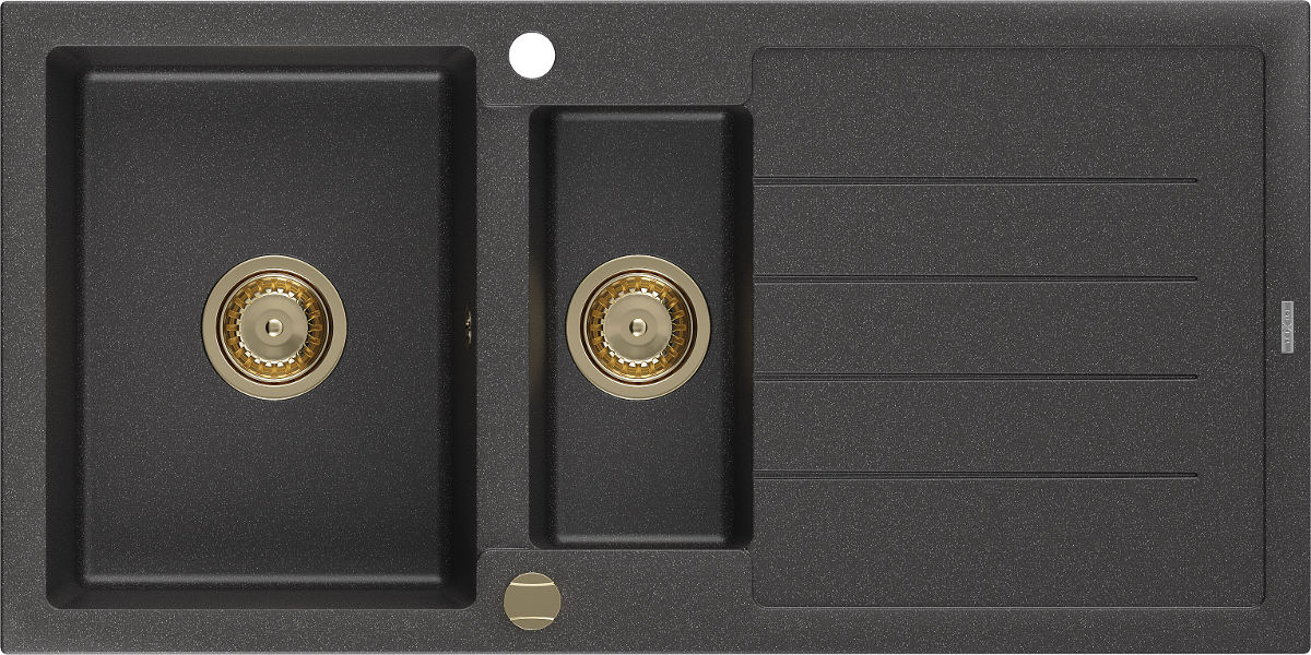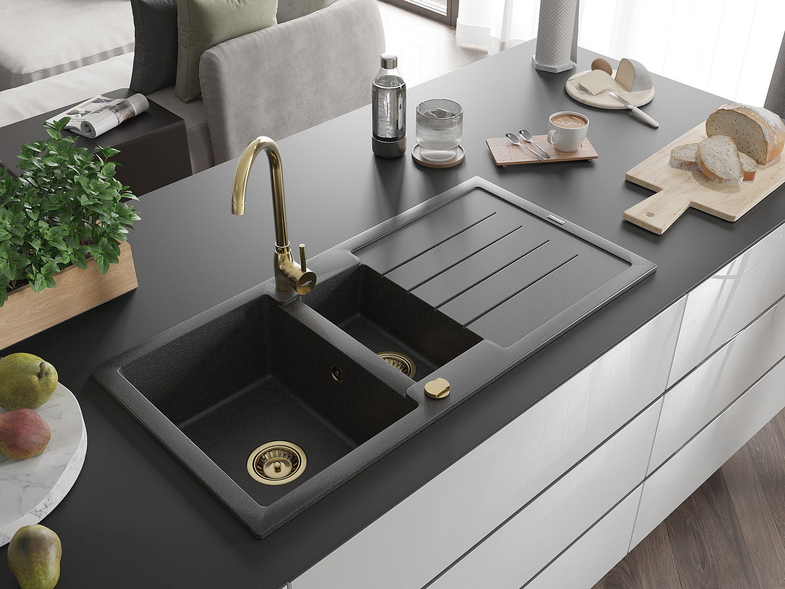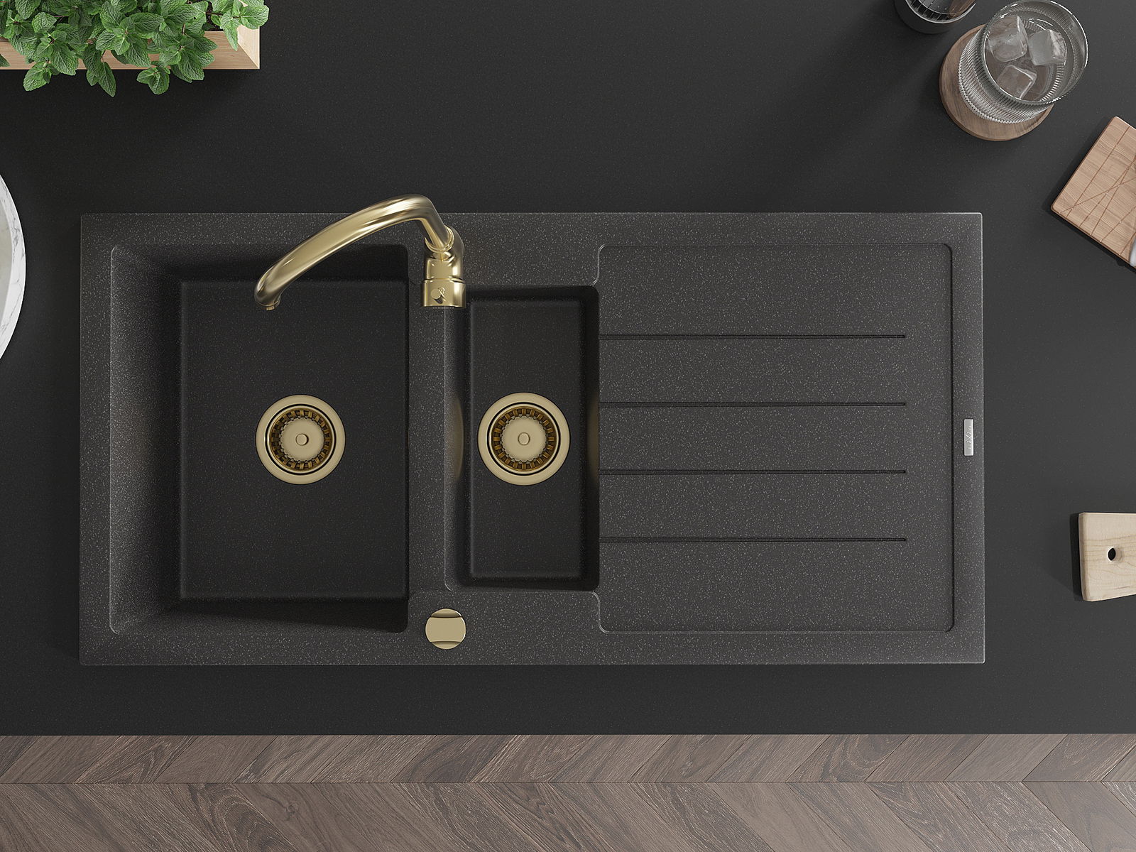 Mexen Andres évier en granit 1,5 bac avec égouttoir 1000 x 500 mm noir moucheté, siphon doré - 6515101510-76-G