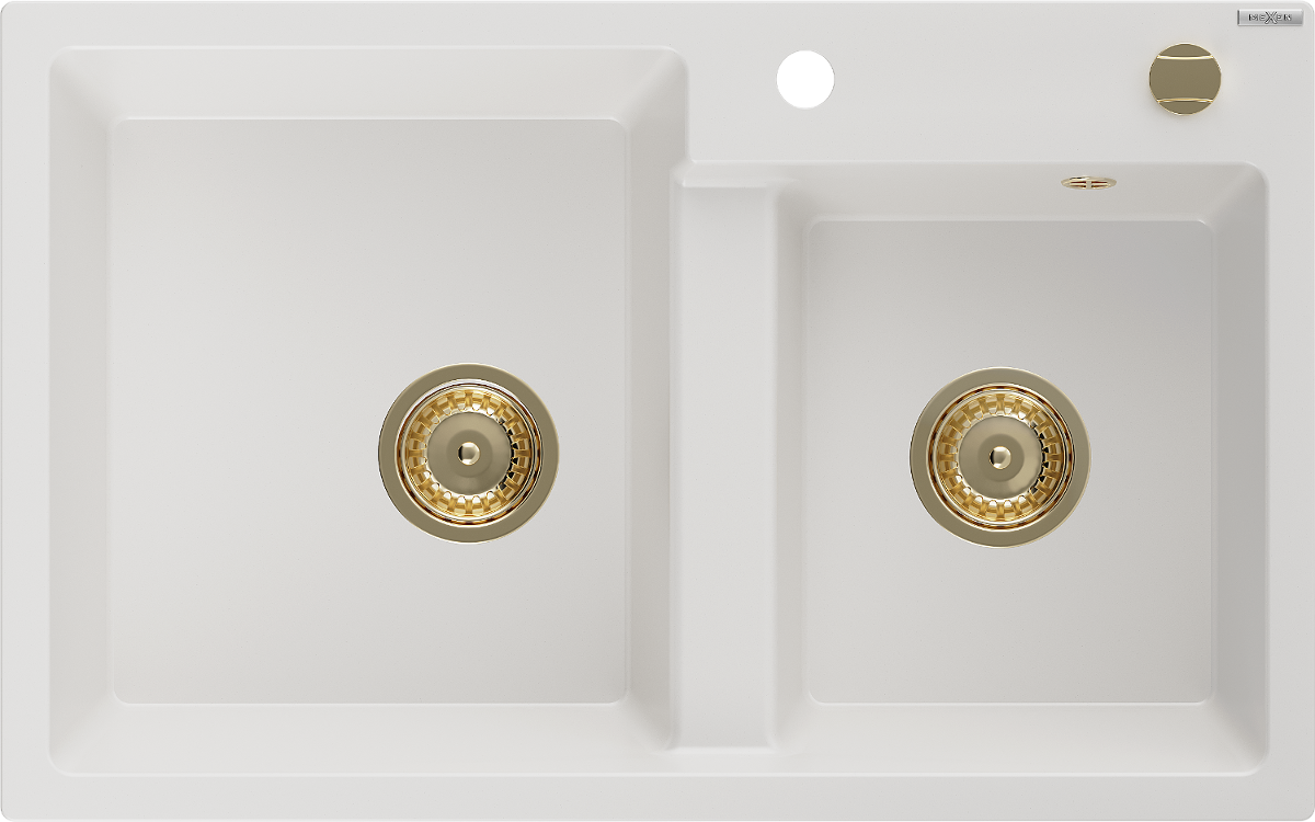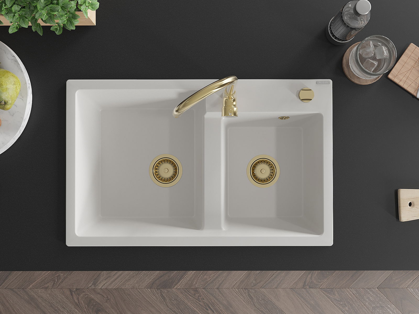 Mexen Tomas évier en granit à 2 bacs 800 x 500 mm, blanc, siphon doré - 6516802000-20-G