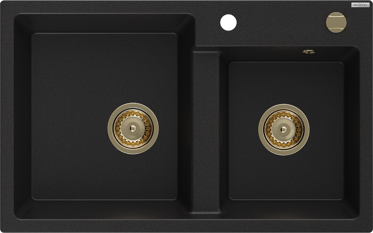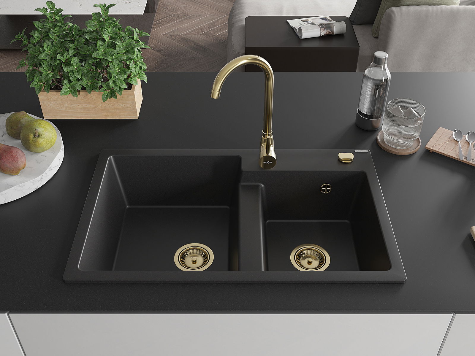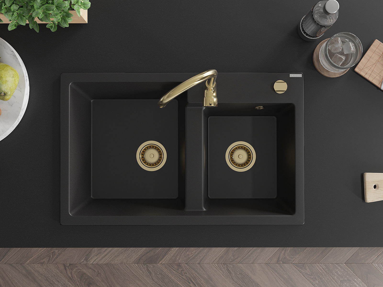 Mexen Tomas évier en granit à 2 bacs 800 x 500 mm, noir, siphon doré - 6516802000-77-G