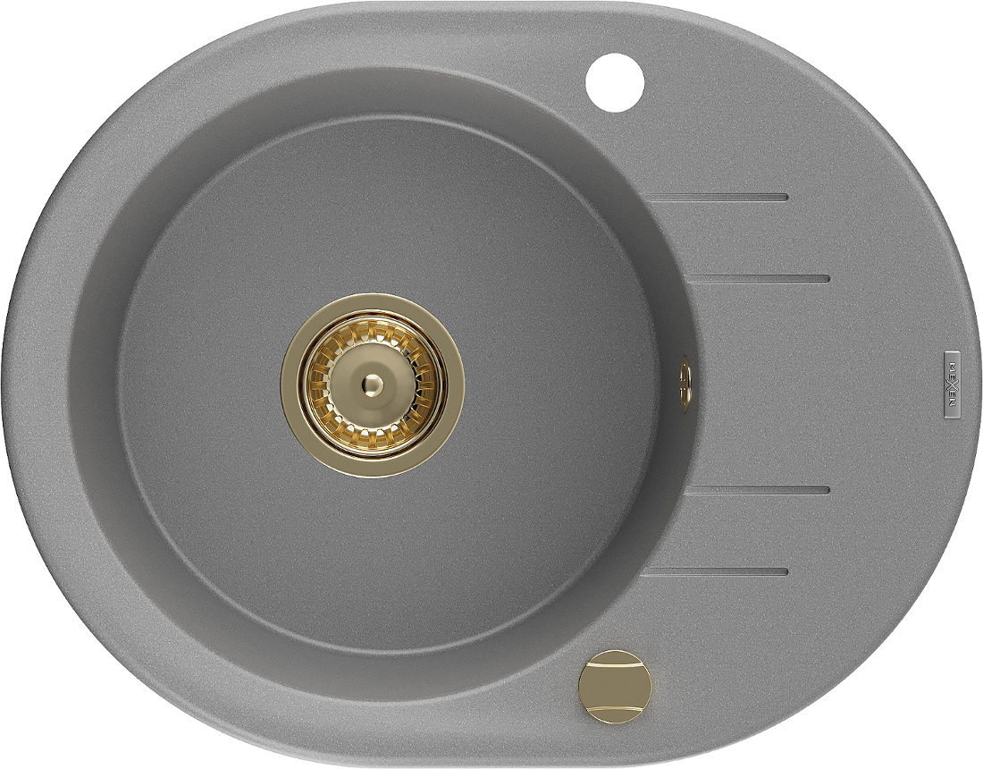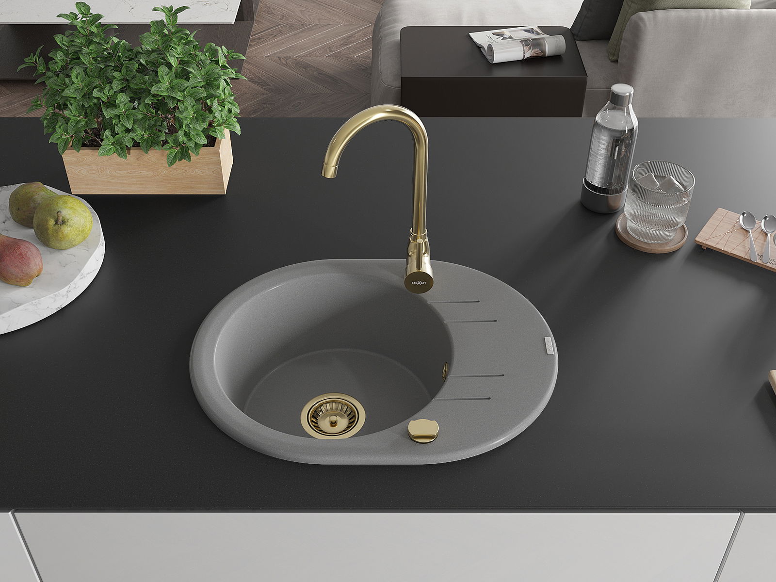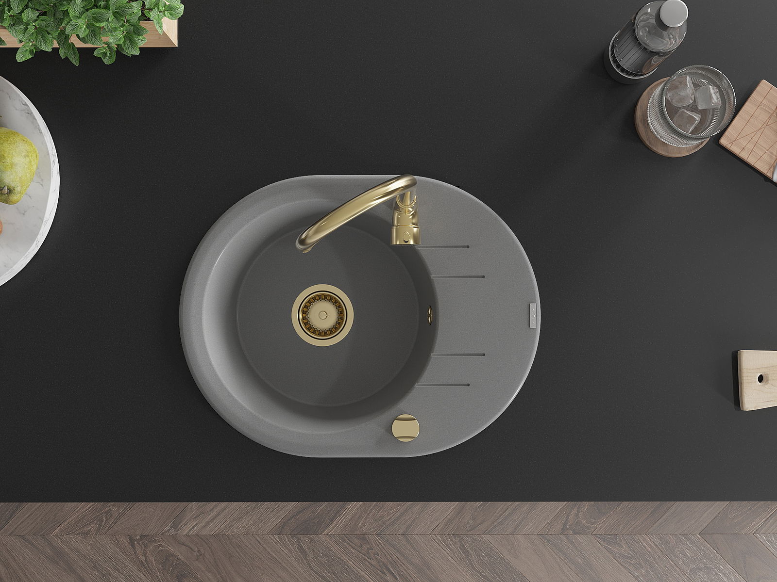 Mexen Kevin évier en granit 1 bac avec égouttoir 586 x 458 mm, gris, siphon doré - 6517581005-71-G