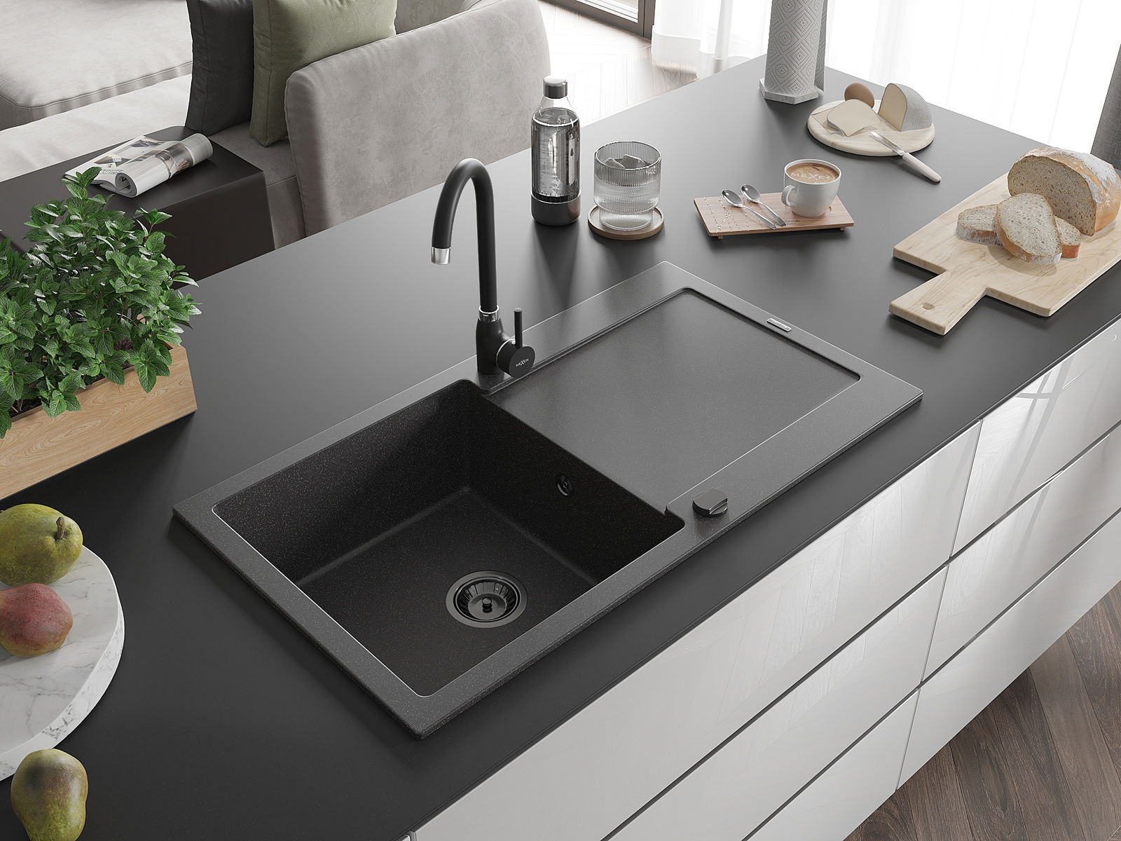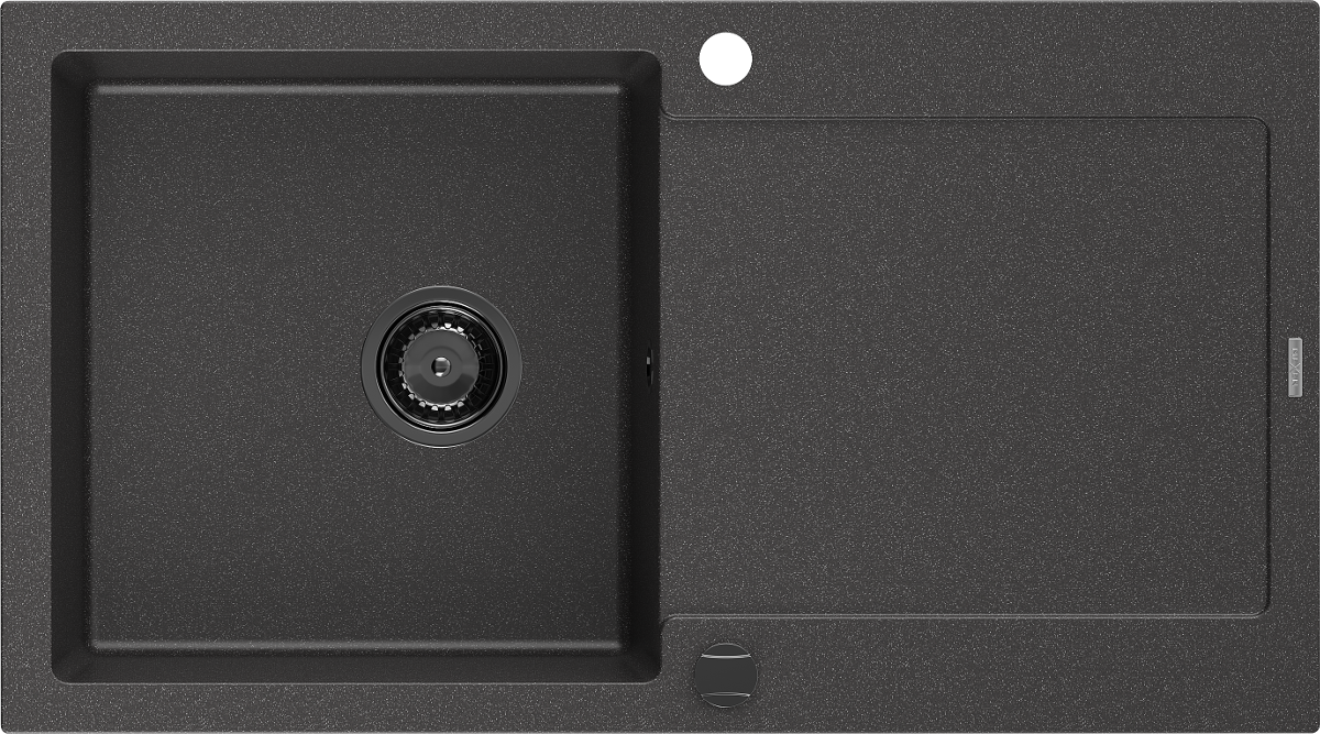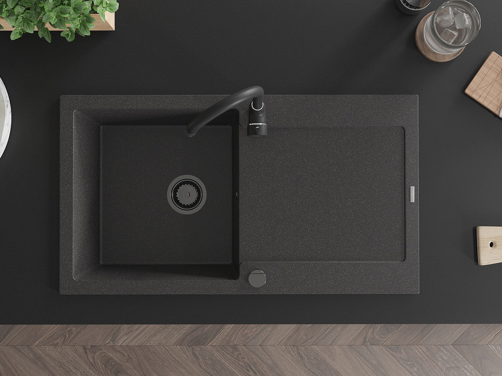 Mexen Leo évier en granit 1 bac avec égouttoir 900 x 500 mm, noir moucheté, siphon noir - 6501901010-76-B