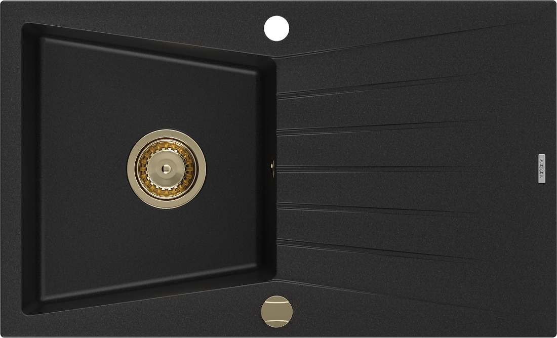Mexen Cesar évier en granit 1 bac avec égouttoir 775 x 470 mm, noir, siphon doré - 6514771010-77-G