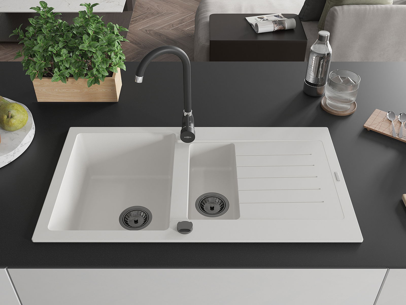 Mexen Matias évier en granit 1,5-bac avec égouttoir 900 x 505 mm, blanc, siphon noir - 6502901505-20-B