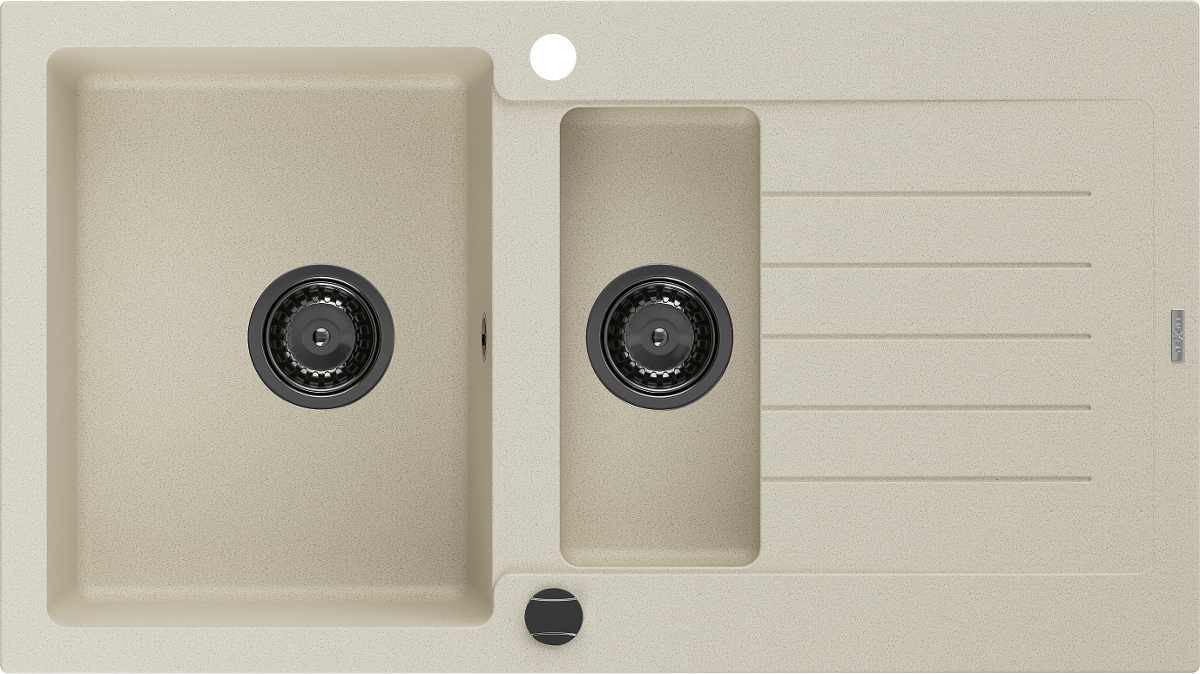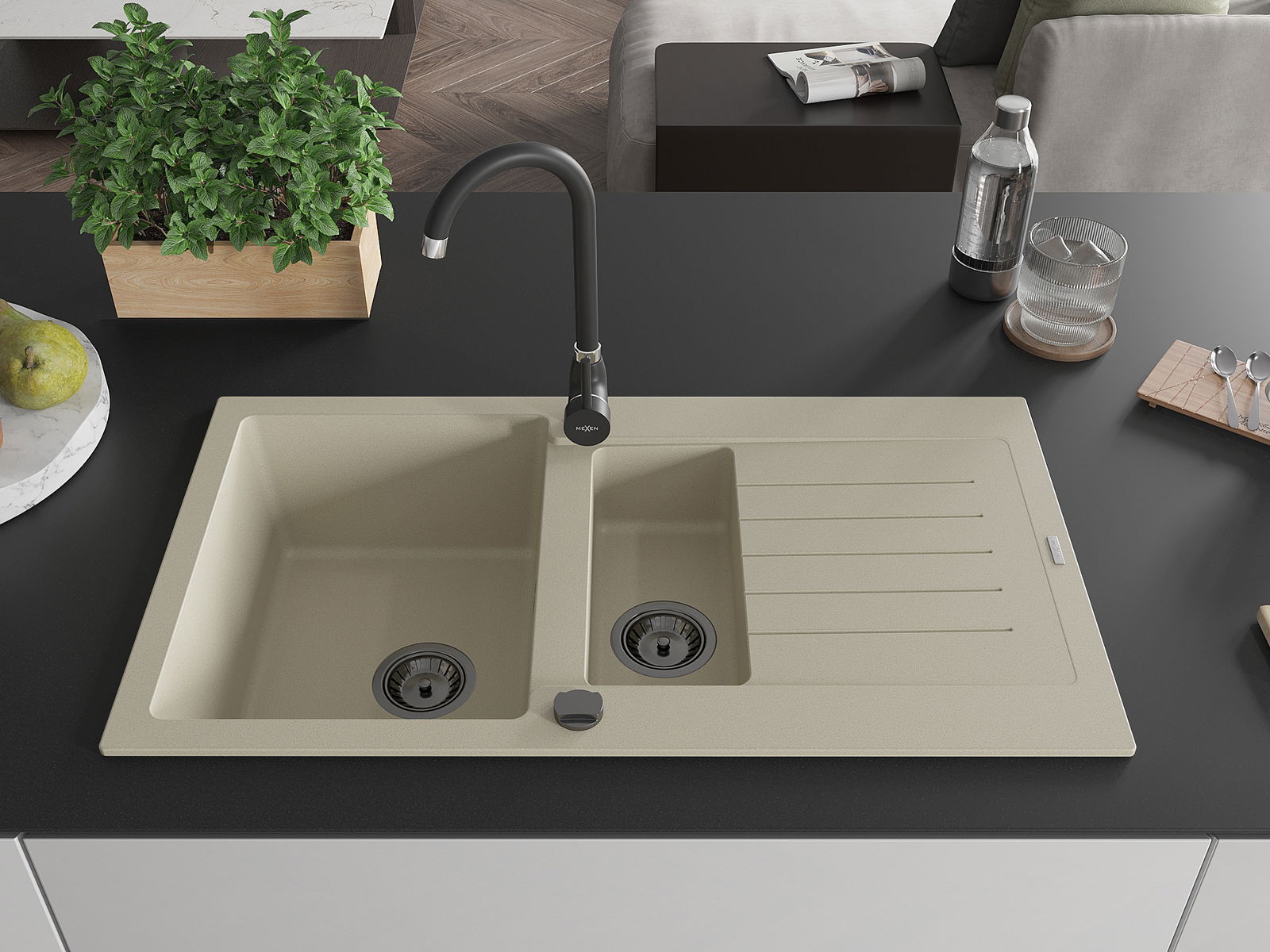 Mexen Matias évier en granit 1,5 bac avec égouttoir 900 x 505 mm, beige, siphon noir - 6502901505-69-B