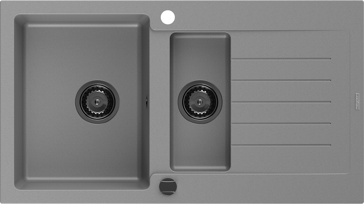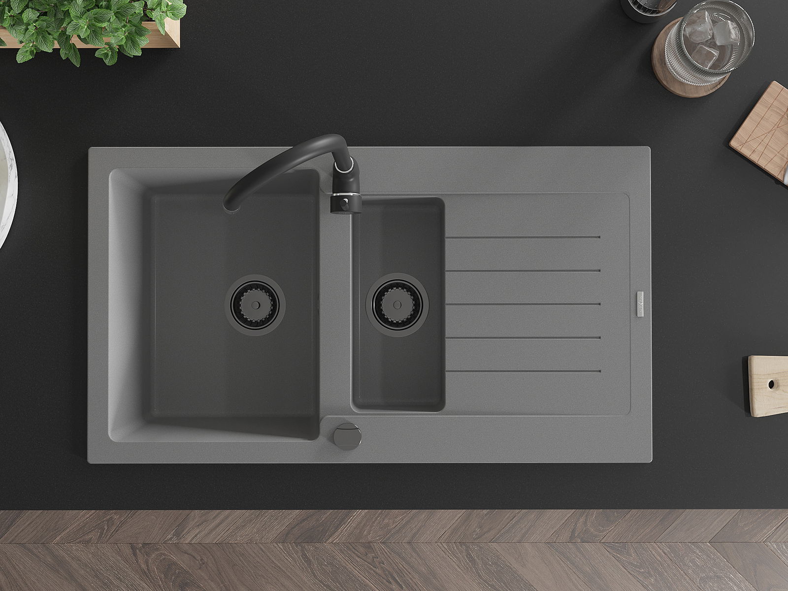 Mexen Matias évier en granit 1,5 bac avec égouttoir 900 x 505 mm, gris, siphon noir - 6502901505-71-B