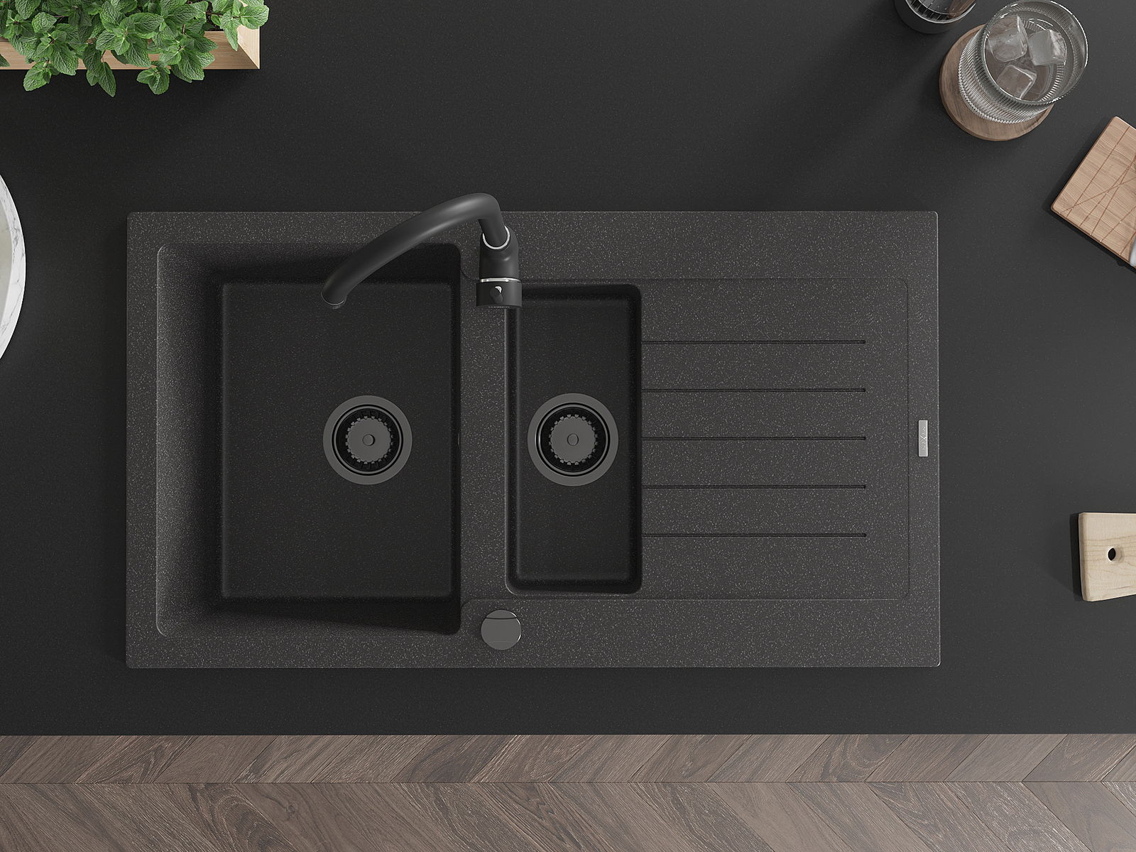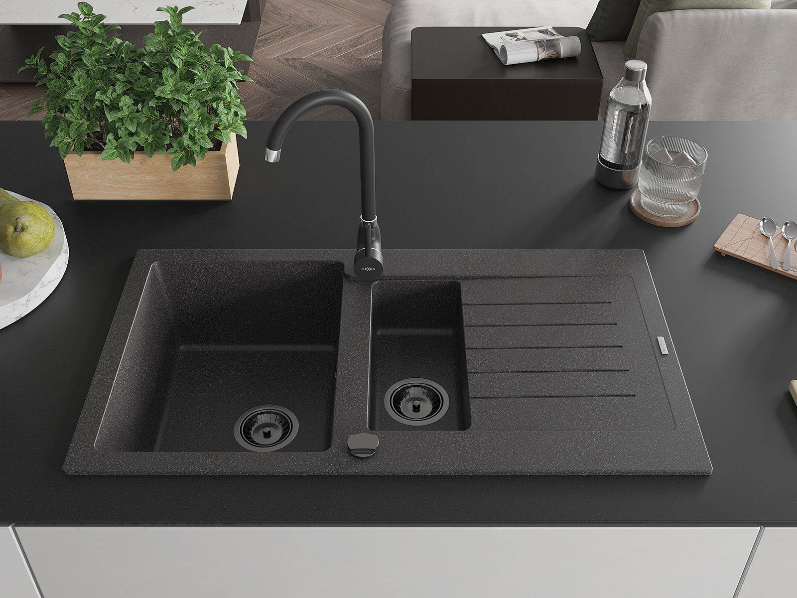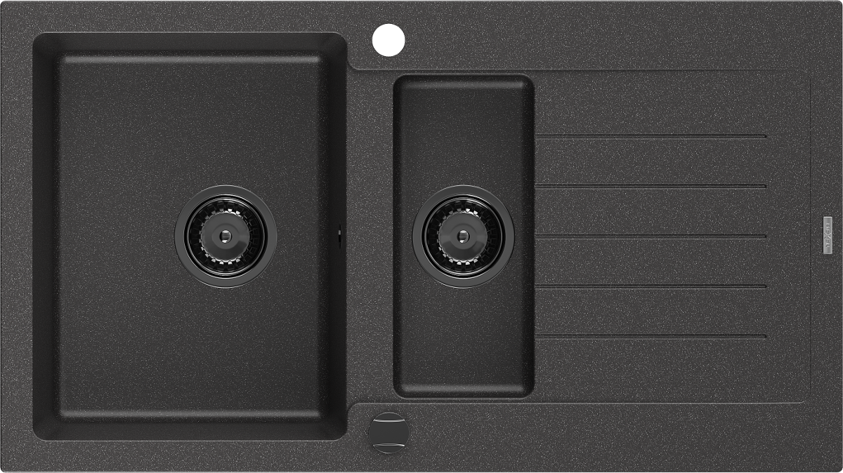 Mexen Matias évier en granit 1,5 bac avec égouttoir 900 x 505 mm, noir moucheté, siphon noir - 6502901505-76-B