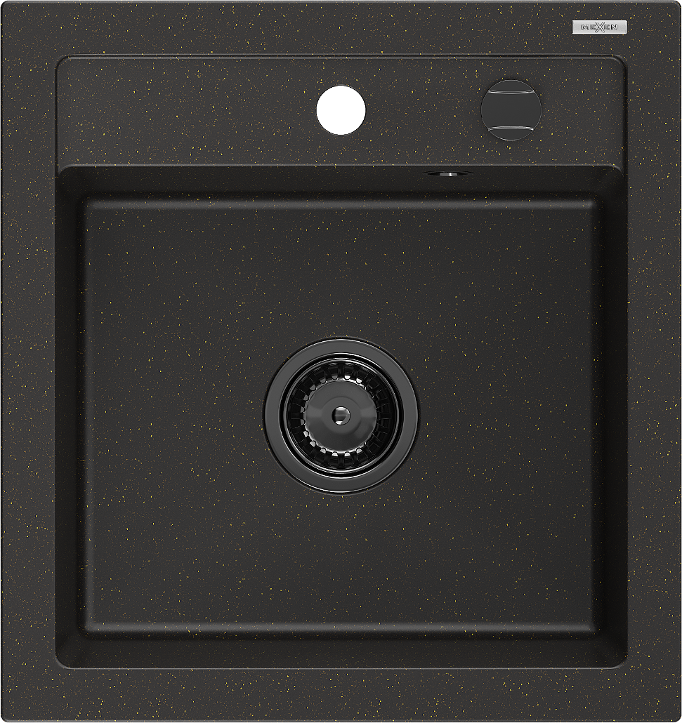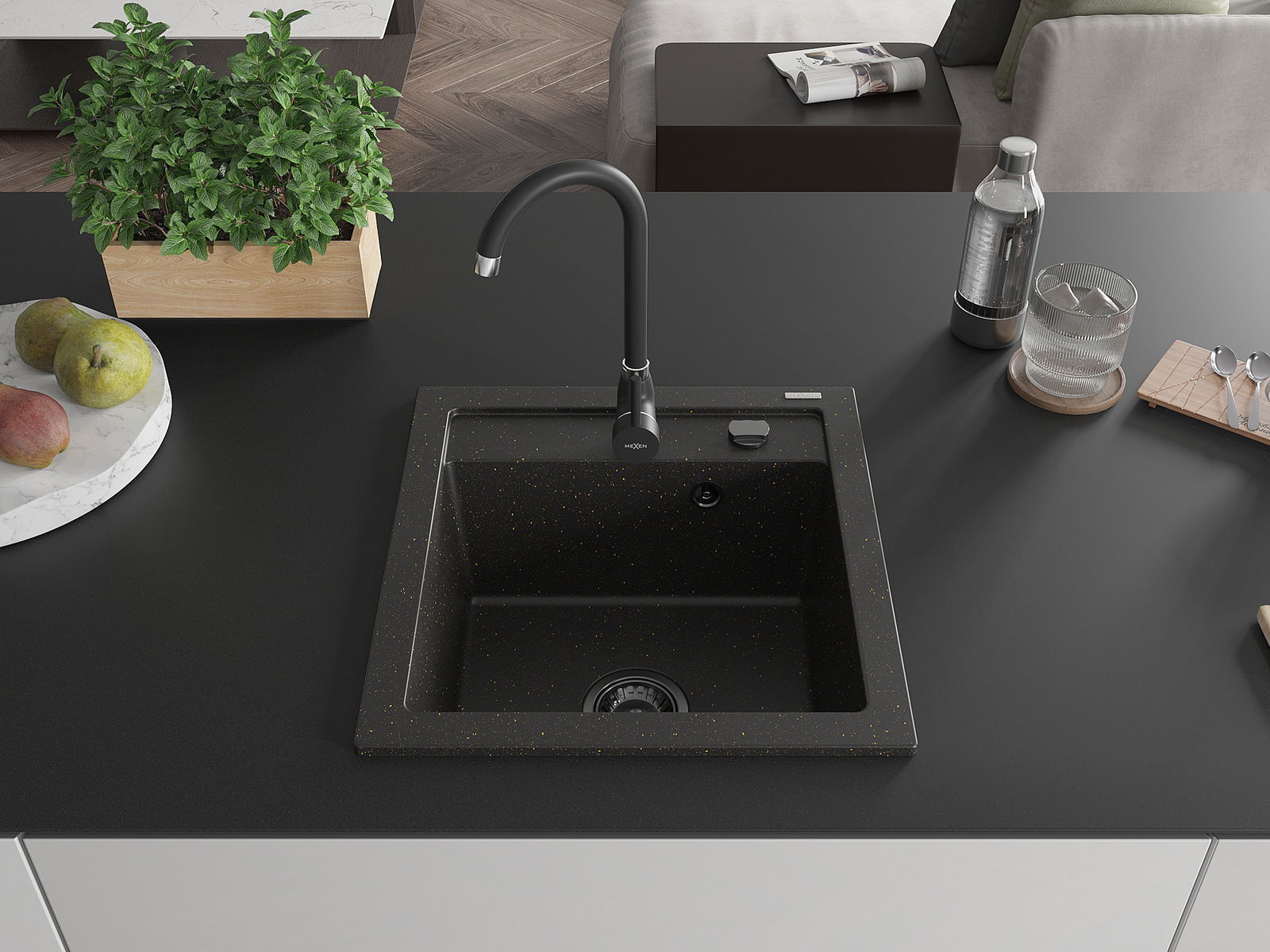Mexen Vito évier en granit 1-bac 520 x 490 mm, noir/doré métallique, siphon noir - 6503521000-75-B